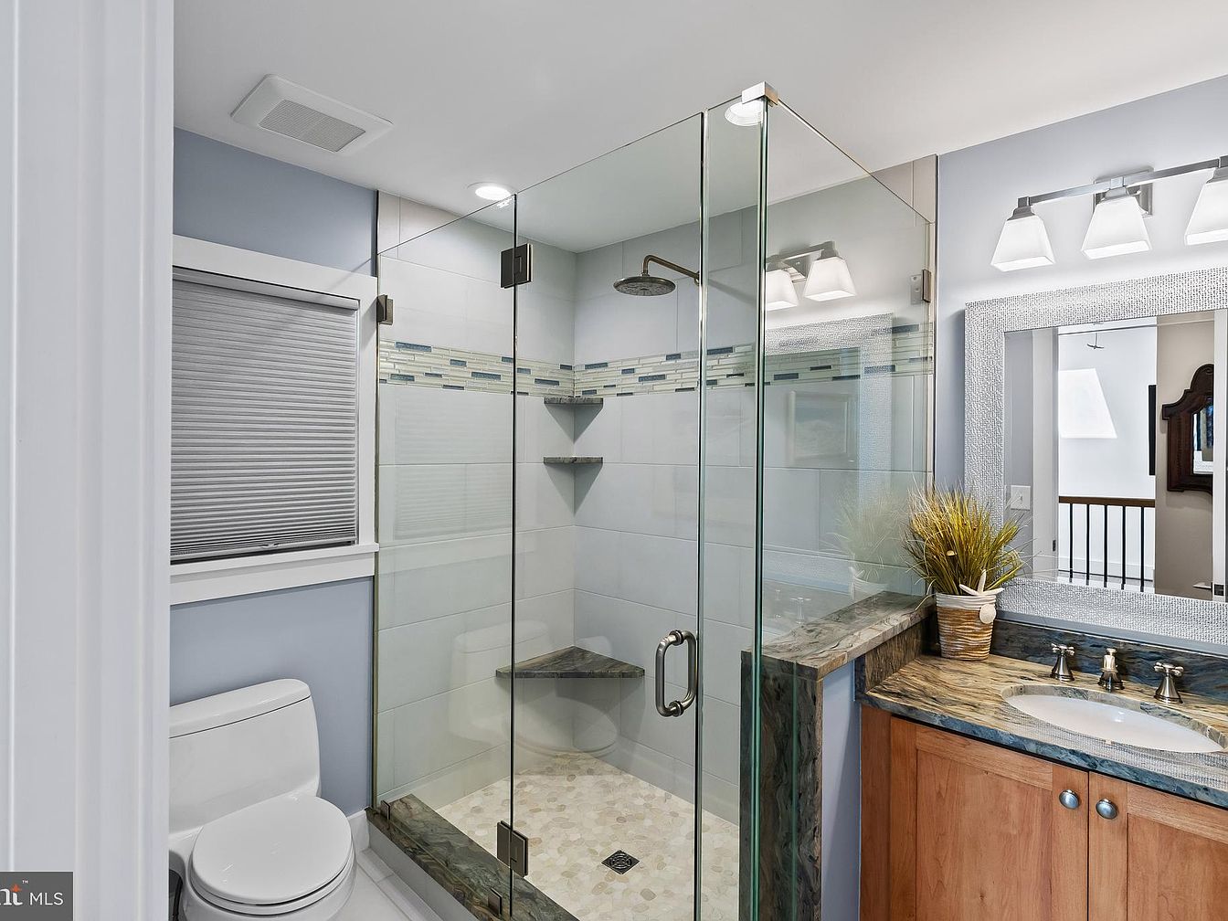 This bathroom features a modern design with a glass shower enclosure, enhancing the space’s openness. Light blue walls complement the white tiles, creating a fresh and inviting atmosphere. A natural stone countertop with rich textures contrasts the smooth surfaces around, while polished chrome fixtures add a touch of elegance. A stylish light fixture illuminates the area above a large mirror, reflecting the contemporary aesthetic. The subtle mosaic tile accents in the shower area introduce depth and visual interest. The addition of potted greenery adds a hint of warmth, balancing the sleek design with organic elements.