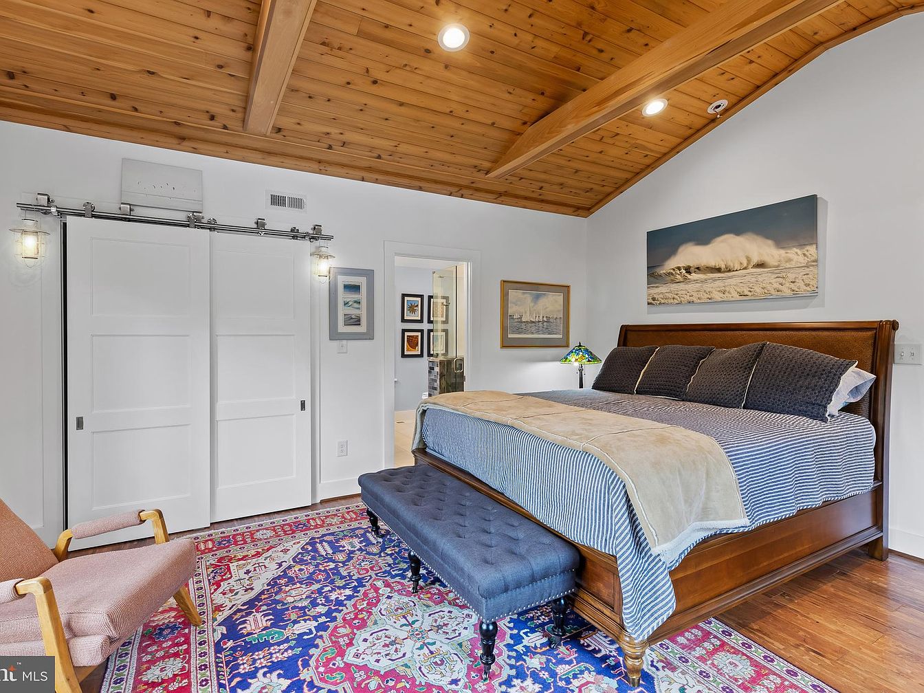 The bedroom features a warm, inviting atmosphere highlighted by wooden beams on the ceiling, which contrast with the bright walls. A king-size bed with a combination of patterned and solid bedding dominates the space, complemented by a stylish upholstered bench at its foot. The rich wood tones of the bed frame and a mid-century modern chair add character. An intricately patterned area rug in vibrant colors ties the room together. Soft lighting fixtures provide a cozy ambiance, while framed artwork on the walls, including a captivating seascape, enhances the soothing coastal theme throughout.
