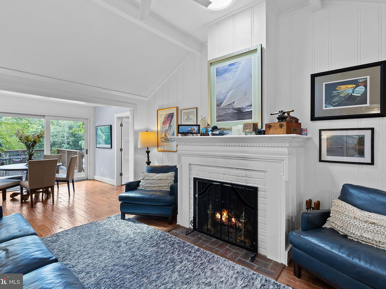 The living room showcases a cozy, inviting atmosphere with a vaulted ceiling and wood accents. A white-brick fireplace with a decorative mantle serves as the focal point, adorned with nautical-themed artifacts. The seating includes deep blue leather sofas and an armchair, complemented by a textured beige rug. Warm oak flooring contrasts with white walls and large windows, inviting natural light. Decorative wall art features framed photographs and paintings, adding a personal touch. A small dining table with upholstered chairs is visible, creating a seamless connection to outdoor views, enhancing the space’s openness and tranquility.