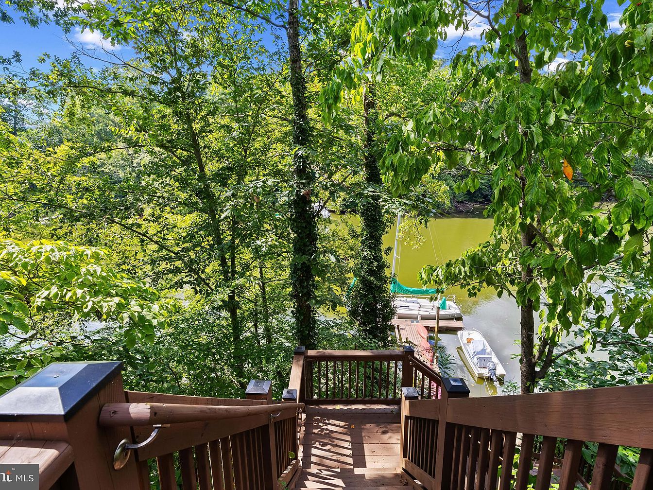 A wooden staircase descends through vibrant greenery towards the water, lined with lush trees in various shades of green. The steps, crafted from warm-toned wood, feature a sturdy handrail that complements the natural surroundings. At the bottom, a view reveals a serene waterway dotted with parked boats, hinting at recreational activities. The bright blue sky peeks through the foliage, enhancing the tranquil atmosphere. Sunlight filters through the leaves, creating dappled patterns on the ground, while the gentle flow of the water continues the calm and inviting aesthetic of this outdoor space.