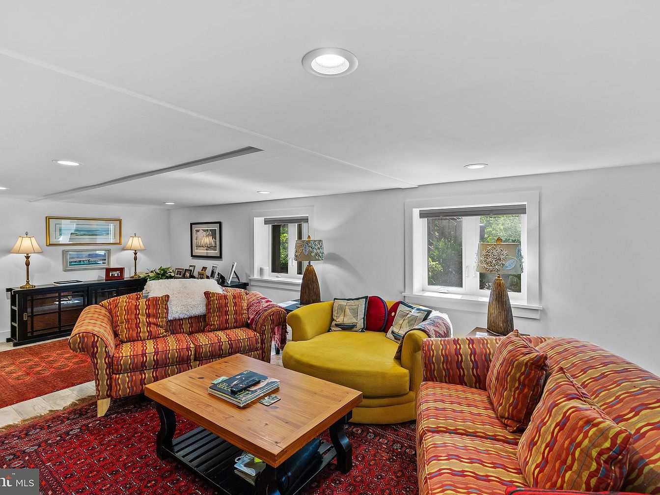 A cozy family room featuring a blend of vibrant and warm colors. The focal point includes a large, striped couch in shades of red, yellow, and orange, complemented by a bright yellow accent chair. A rustic wooden coffee table sits centrally, showcasing magazines and decorative items. The space is illuminated by recessed lighting and two stylish lamps on side tables, enhancing its inviting atmosphere. A patterned area rug adds texture beneath the seating arrangement. Walls are adorned with framed photographs and artwork, while windows invite natural light, offering views of greenery outside.