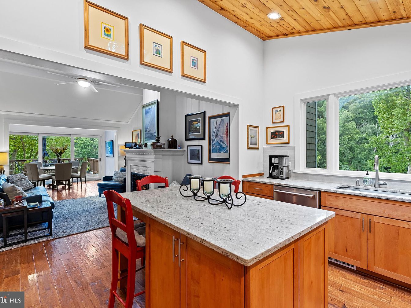 A spacious kitchen featuring a prominent island made from polished stone with sleek cabinetry. The warm wooden tones from the island contrast beautifully with the light gray countertops. Red bar stools add a pop of color, while the walls are adorned with framed artwork, enhancing the aesthetic appeal. Large windows allow natural light to flood the space, offering views of the lush greenery outside. The ceiling is accented with natural wood planks, creating a cozy, inviting atmosphere. Light hardwood flooring enhances the brightness of the kitchen and connects it seamlessly with the adjacent living area.