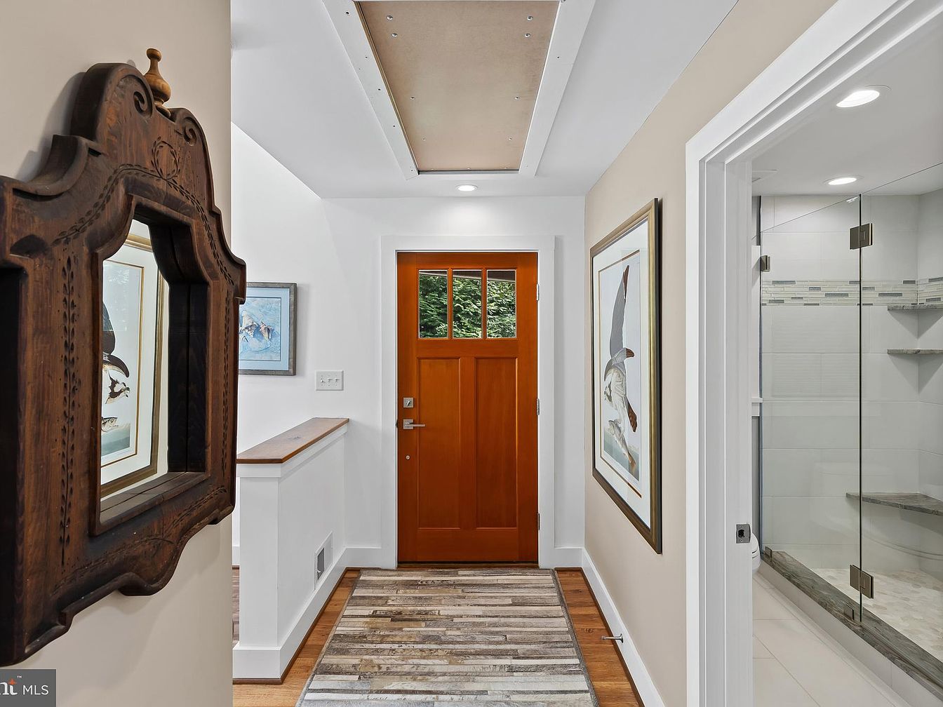 A welcoming entryway showcases rich textures and thoughtful design. A tall, warm wooden door features multiple glass panes, allowing natural light to flow in. To the left, an ornate vintage mirror reflects the space, surrounded by neutral wall tones. The floor displays a modern, wide plank design in warm wood hues, contrasting with the lighter walls. Framed artwork offers a pop of color, while a narrow ledge adds functionality without clutter. A glass shower enclosure hints at a nearby bathroom, boasting sleek lines and minimalistic tiles, merging classic style with contemporary elements, creating an inviting atmosphere.