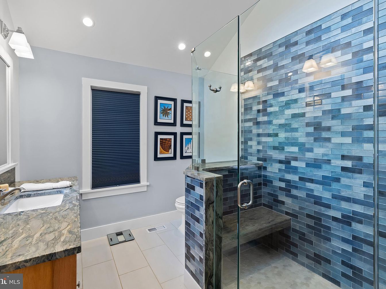 A modern bathroom featuring a spacious glass-enclosed shower with a striking blue tile wall that adds a vibrant touch to the space. The color scheme includes soft blue tones against a light gray backdrop, creating a calming atmosphere. Natural stone, utilized in the countertop and shower bench, enriches the design with texture. The vanity area is equipped with a white sink and sleek hardware, surrounded by decorative framed artwork and a dark window treatment that contrasts nicely with the light walls. Bright recessed lighting enhances the overall brightness, contributing to an inviting, serene ambiance.