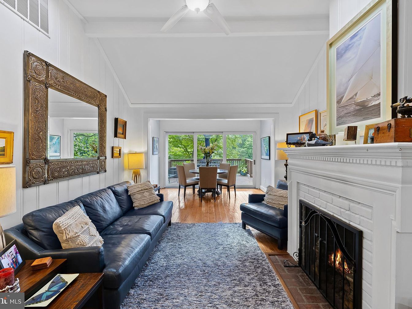 A bright and inviting living room features a spacious layout with light hardwood flooring and white walls that enhance its openness. A large navy leather sofa is complemented by a cozy textured throw and decorative cushions. A plush area rug adds softness underfoot. The room is illuminated by warm lighting from stylish lamps flanking the sides. A decorative mirror and framed artwork adorn the walls, providing character. The fireplace, framed in white brick, stands as a focal point, while large glass doors lead to an outdoor deck, merging indoor and outdoor living and offering views of surrounding greenery.