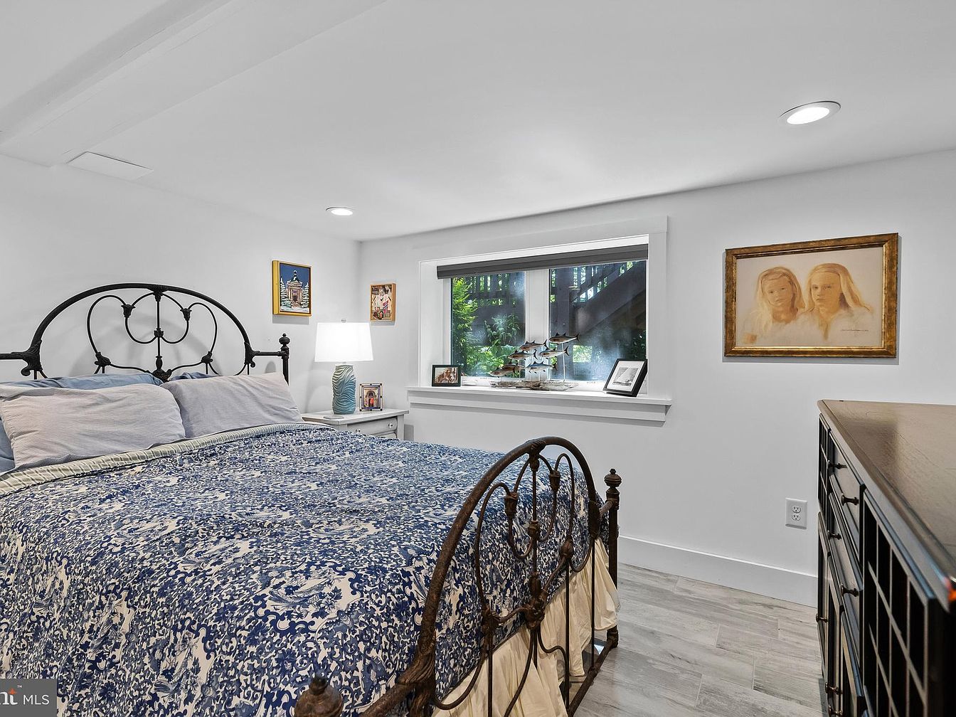 This cozy bedroom features a vintage wrought iron bed with a navy and white patterned quilt, adding a charming focal point. The room is brightened by natural light streaming through a window adorned with a leafy view. A simple wooden nightstand showcases a soft lamp, creating a warm glow. Framed artwork adds personal touches to the walls, including a portrait and thematic prints. Light-colored wooden flooring complements the white walls and a spacious dresser enhances functionality without overpowering the design. Overall, the aesthetic balances modern comfort with a touch of historical character, creating an inviting retreat.