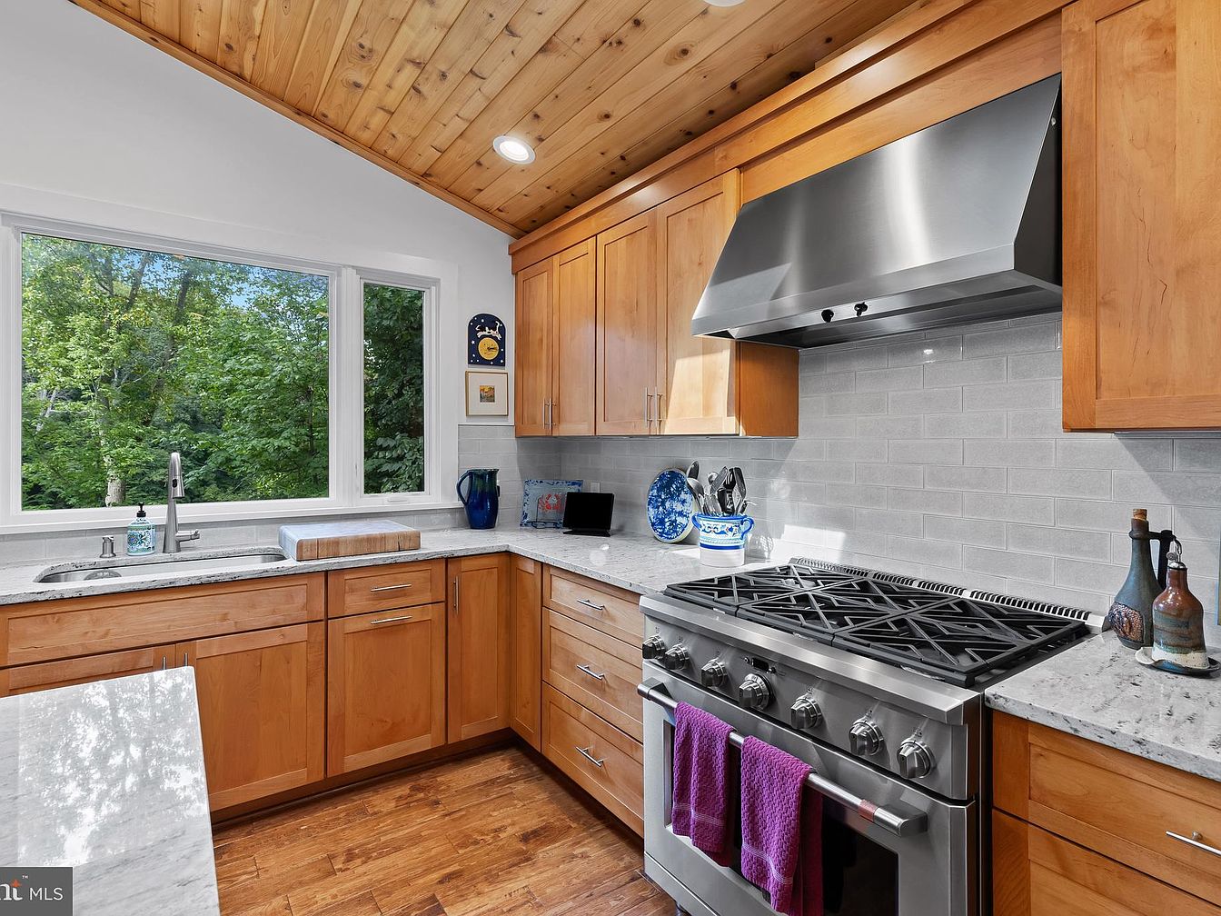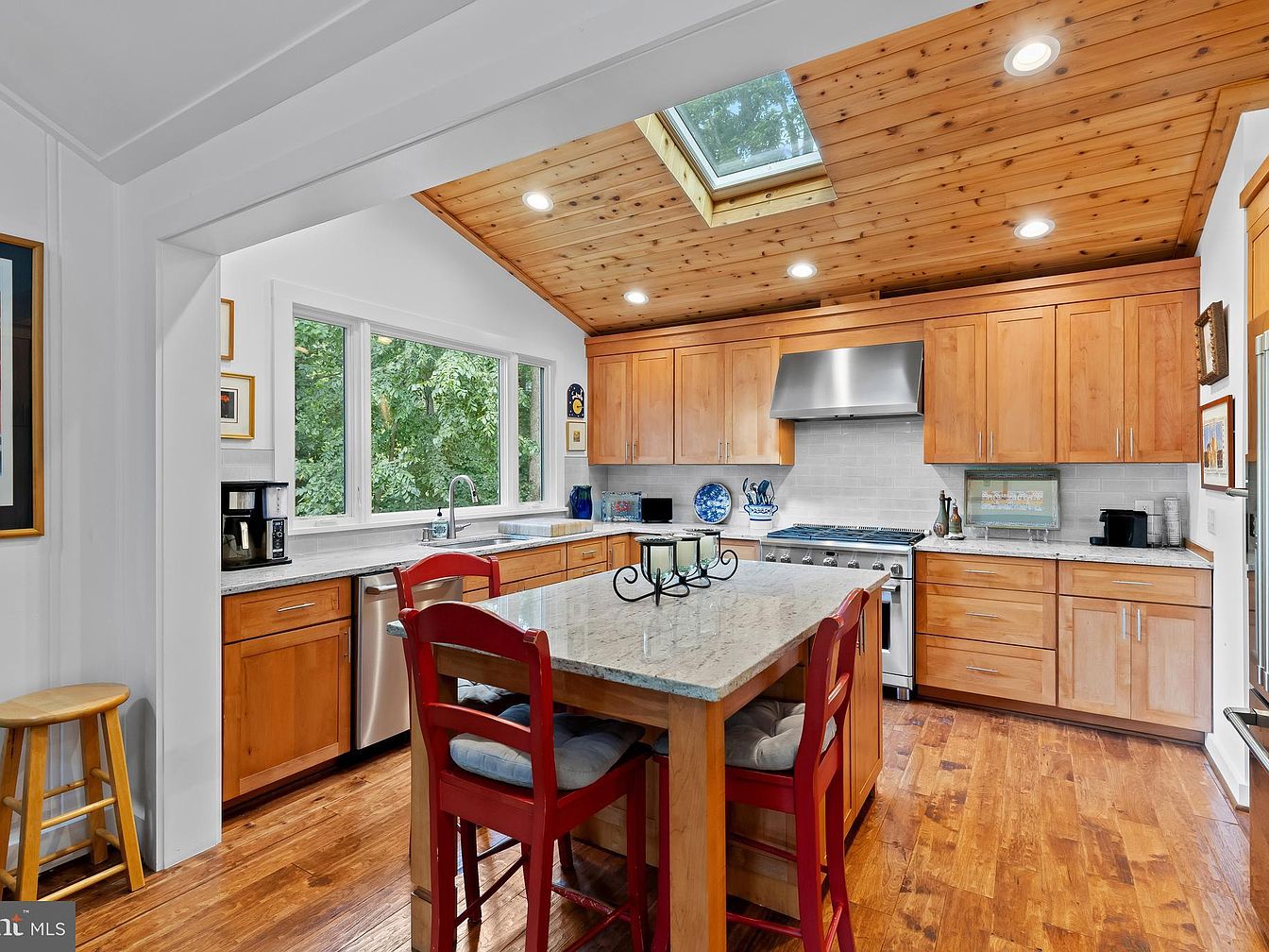 This kitchen merges modern functionality with rustic charm. The light wooden cabinetry complements the polished granite countertop, creating a warm, inviting atmosphere. A central island features red seating, adding a pop of color against the natural tones. A skylight brightens the room, enhancing the wooden ceiling with its rich texture. Large, double-pane windows frame views of lush greenery outside, while the stainless-steel appliances add a contemporary touch. Decor accents on the walls reflect a thoughtfully curated aesthetic, contributing character to this beautiful space. The harmonious blend of materials fosters both comfort and style.