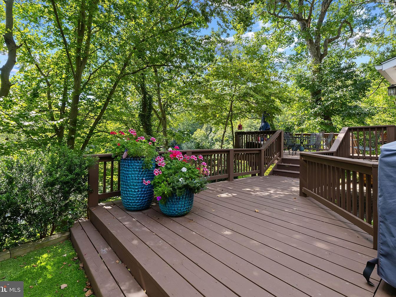 The patio features a spacious wooden deck, stained in a warm brown hue, inviting relaxation amidst lush greenery. Two vibrant blue planters overflowing with pink flowers add a pop of color, contrasting beautifully against the earthy tones of the deck. Surrounding trees provide ample shade, creating a serene atmosphere. In the background, a glimpse of outdoor furniture suggests a welcoming space for gatherings. Sturdy railings provide safety while enhancing the rustic charm of the area. The gentle sunlight filtering through leaves creates a picturesque ambiance, perfect for enjoying nature and outdoor living.
