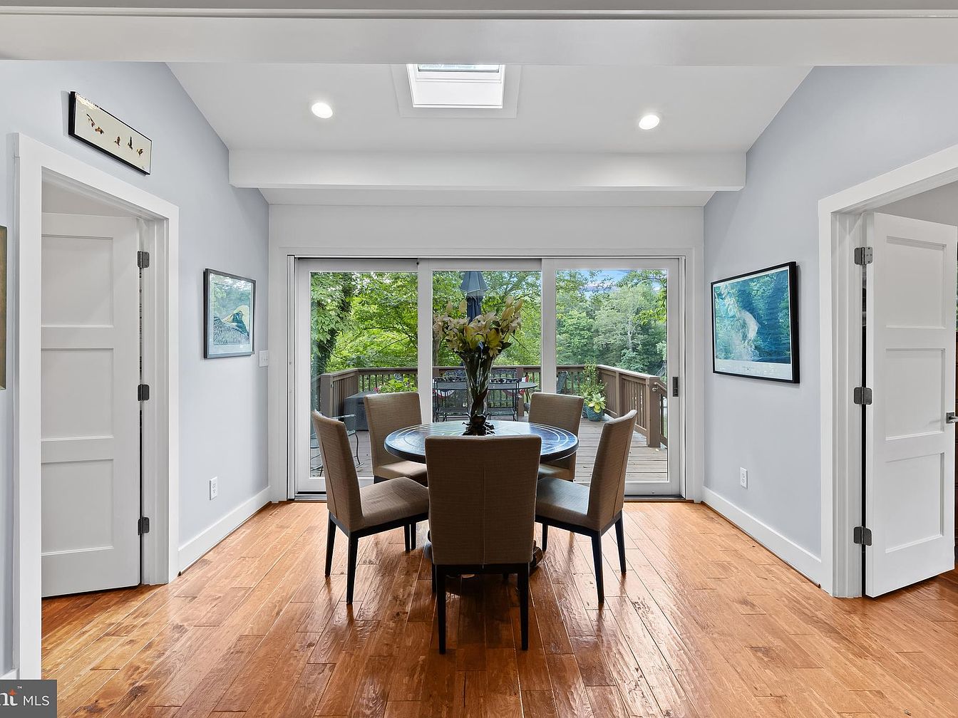 This inviting dining area features a circular table surrounded by four upholstered chairs, creating a cozy atmosphere. The hardwood floor exhibits a rich, warm hue, enhancing the space’s charm. Light gray walls offer a soft backdrop, complemented by art pieces that add a touch of color. A skylight above bathes the area in natural light, while large sliding doors provide a view and access to the deck outside. The careful arrangement of furniture encourages conversation and connection, reflecting a modern yet welcoming design. Overall, the aesthetic blends comfort with contemporary elegance.