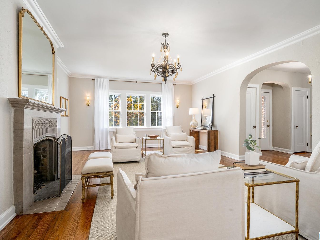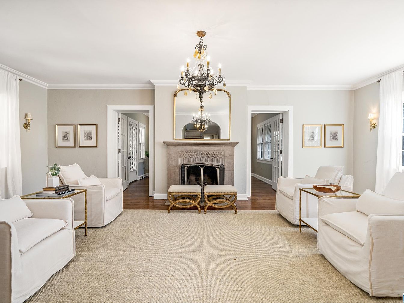 Spacious living room with a soothing neutral palette, featuring soft off-white walls and ceiling accented by crown molding. A substantial stone fireplace with decorative detailing anchors one side, topped with a large gold-framed mirror. Comfortable armchairs and a plush bench create a conversational seating arrangement centered around a textured ivory area rug. Warm-toned wooden floors add contrast to the otherwise light decor. A striking wrought-iron chandelier hangs from the ceiling, while delicate wall sconces and natural light from a wide bank of windows infuse the space with brightness. Arched doorways and simple yet elegant furnishings maintain a classic, inviting ambiance.