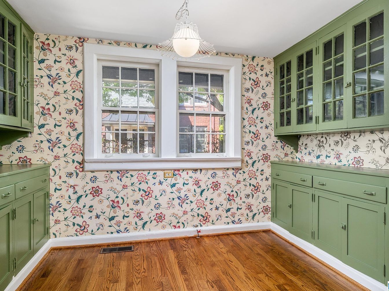 A sunny, inviting nook featuring hardwood floors with a rich, warm finish. Both sides of the room are lined with built-in cabinets painted a medium sage green, each with glass-front upper doors and matching solid lower doors and drawers. The vintage charm is accentuated by floral wallpaper in cream tones, decorated with vibrant pink, red, and blue flowers and winding green stems across all visible walls. Two large, double-hung windows framed in crisp white allow natural light to fill the space. A white pendant light with a pleated shade hangs from the center of the ceiling, further brightening the room.