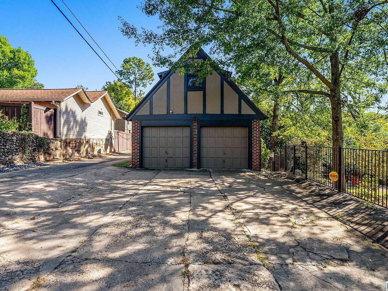 A Tudor-style detached garage sits at the end of a wide, cracked concrete driveway lined with a black iron fence on one side and a stone retaining wall on the other. The garage features two brown paneled doors framed by red brick columns, with beige and dark blue half-timbered details on the upper facade. Overhanging branches from mature trees offer shade and dappled sunlight across the driveway. The setting is quiet and leafy, with a neighboring house visible in the background, adding to the historic American home’s established and welcoming atmosphere.