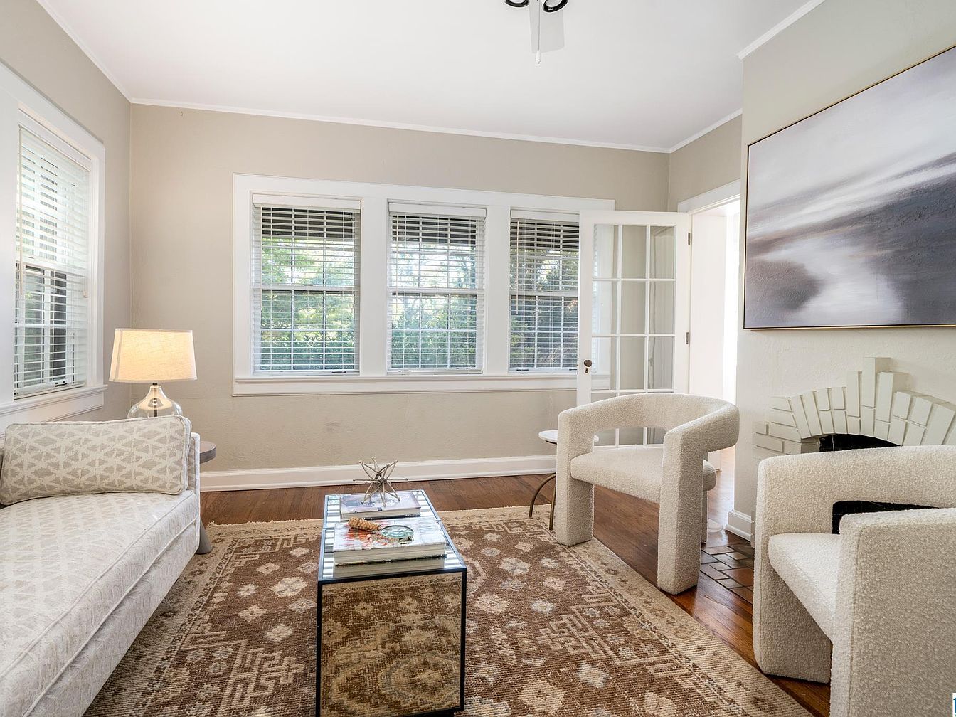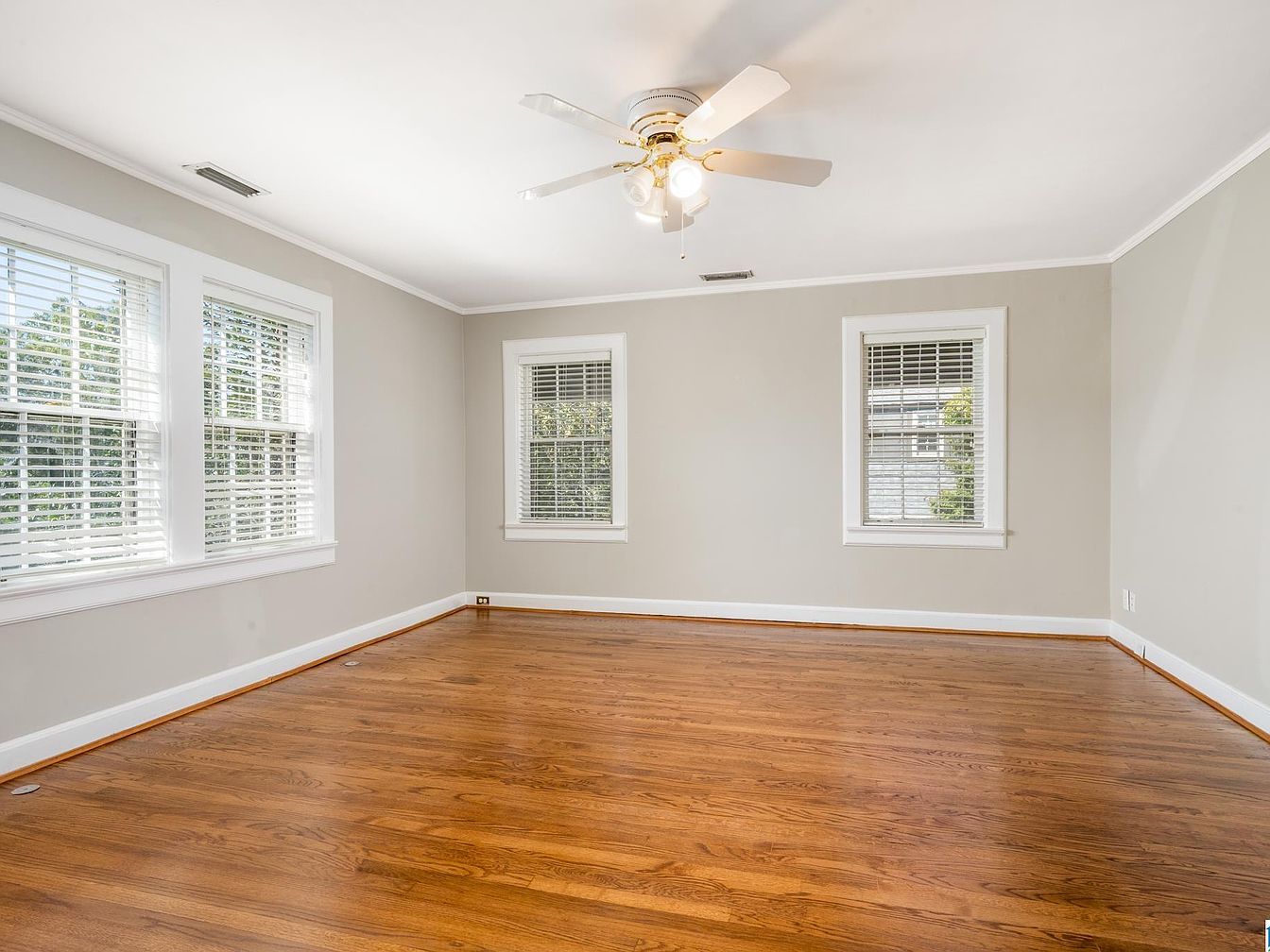 Spacious and bright living room featuring gleaming medium-toned hardwood floors and soft gray walls with crisp white trim throughout. Three large windows on one wall and a single window on another allow abundant natural light to filter into the room. The ceiling is white with subtle crown molding, and a central white ceiling fan with a brass fixture and LED lights provides overhead illumination. The rectangular layout is open and versatile, with a serene and modern color palette that complements the historic architectural charm. The windows have classic white wooden blinds, adding a clean, tailored element to the space.