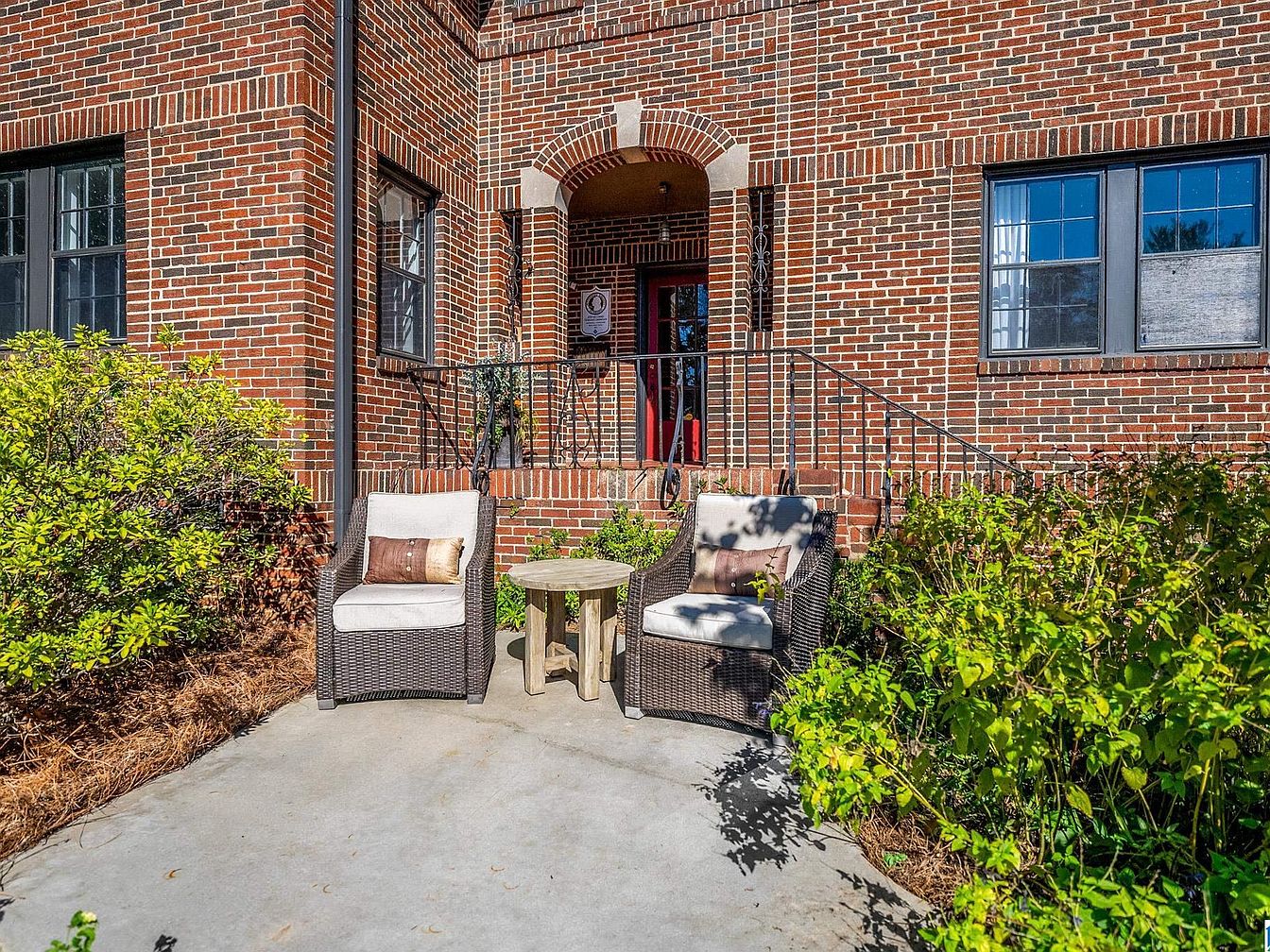 A welcoming outdoor seating area is nestled at the foot of a red brick historic home, framed by leafy landscaping and green shrubbery on either side. Two wicker armchairs with plush white cushions and small accent pillows are arranged facing each other, separated by a rustic wooden side table. The patio is paved in concrete and sits just in front of the curved steps and black metal railing leading up to a classic arched entryway with a red front door. The overall look is both charming and approachable, inviting relaxation while incorporating period architectural detail.