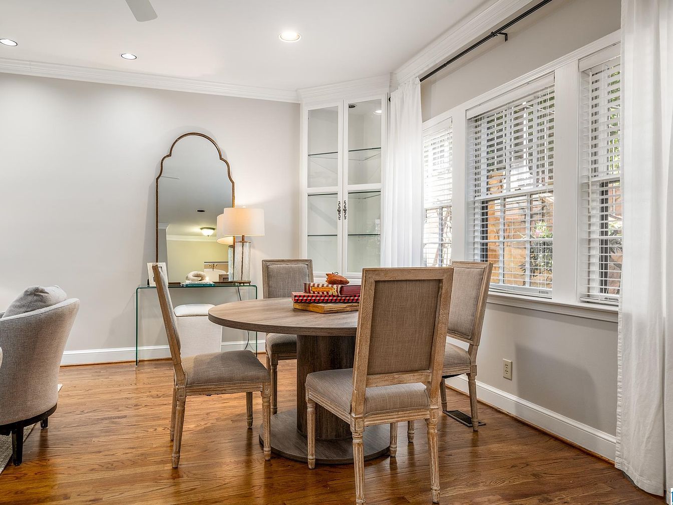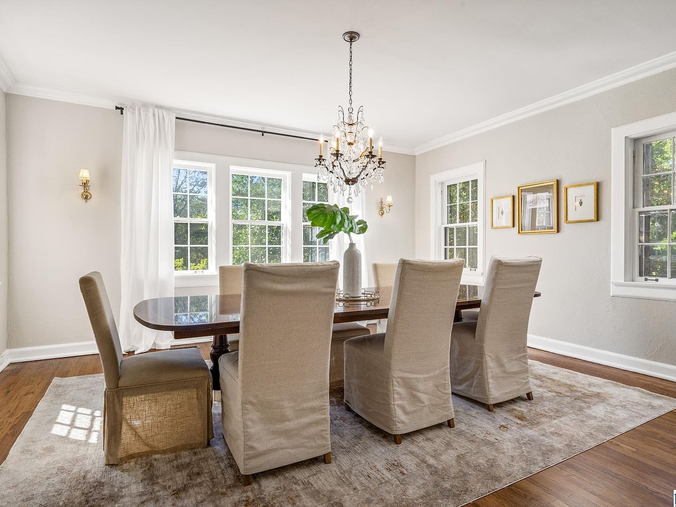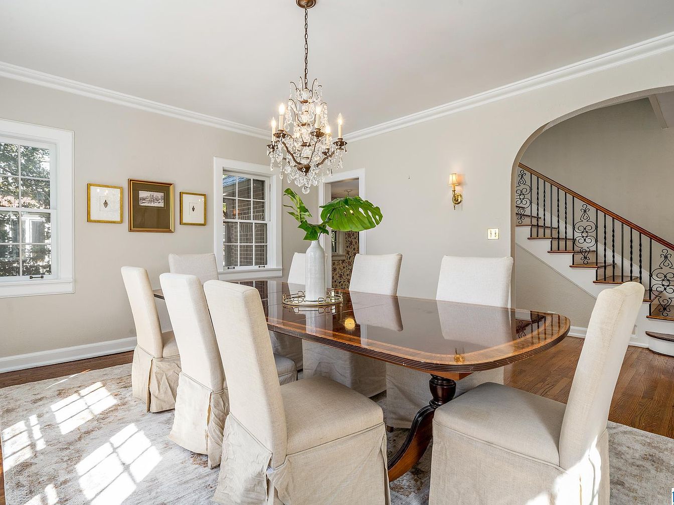 A spacious and elegant dining room with a polished wood table at the center, surrounded by eight cream-colored, slipcovered chairs. Above the table hangs a sparkling crystal chandelier, providing a touch of vintage glamour. The walls are painted a soft neutral beige, complemented by white crown molding and trim around the windows. Three framed artworks in gold frames are arranged on one wall. Natural light pours in through large windows, reflecting off the sheen of the table. In one corner, a gracefully curved staircase with ornate wrought iron balusters and wooden treads adds architectural interest to the room.