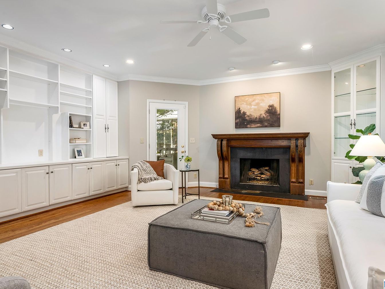 A spacious living room with a neutral, calming color palette consisting of light gray walls, white ceilings, and natural wood flooring. Built-in white cabinetry with open shelving and glass-fronted display cases lines the left and far wall, providing both storage and decorative space. A dark, ornate wooden fireplace anchors the room, topped by a landscape painting in muted earth tones. Furnishings include a large, square gray ottoman in the center, a white upholstered sofa, and a matching armchair adorned with accent pillows. Subtle lighting recessed in the ceiling and a table lamp add warm illumination, enhancing the cozy atmosphere.