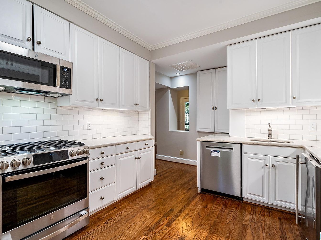 A spacious kitchen features a combination of clean, classic design elements with modern appliances. White cabinetry with brushed metal knobs offers a bright, airy feel, complemented by a white subway tile backsplash that runs along the perimeter. Shiny stainless steel appliances, including a gas range, built-in microwave, and dishwasher, stand out against the neutral palette. Warm-toned hardwood floors bring contrast and warmth to the space. The countertops appear to be a light stone or composite material, adding to the kitchen’s fresh and inviting ambiance. Ample cabinetry provides storage, while recessed lighting ensures the kitchen is well-lit and practical.