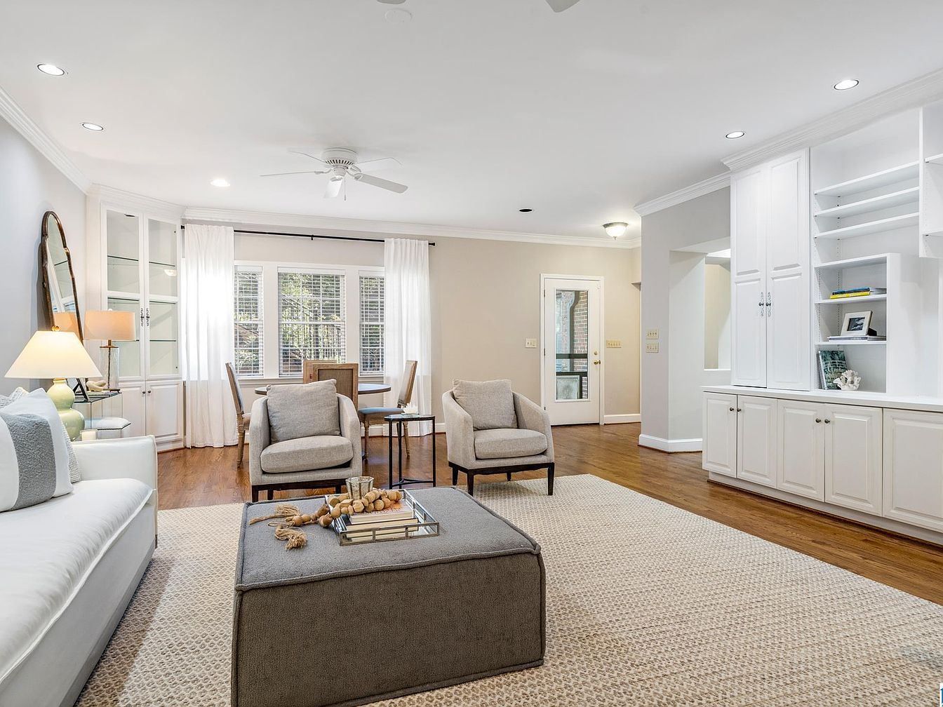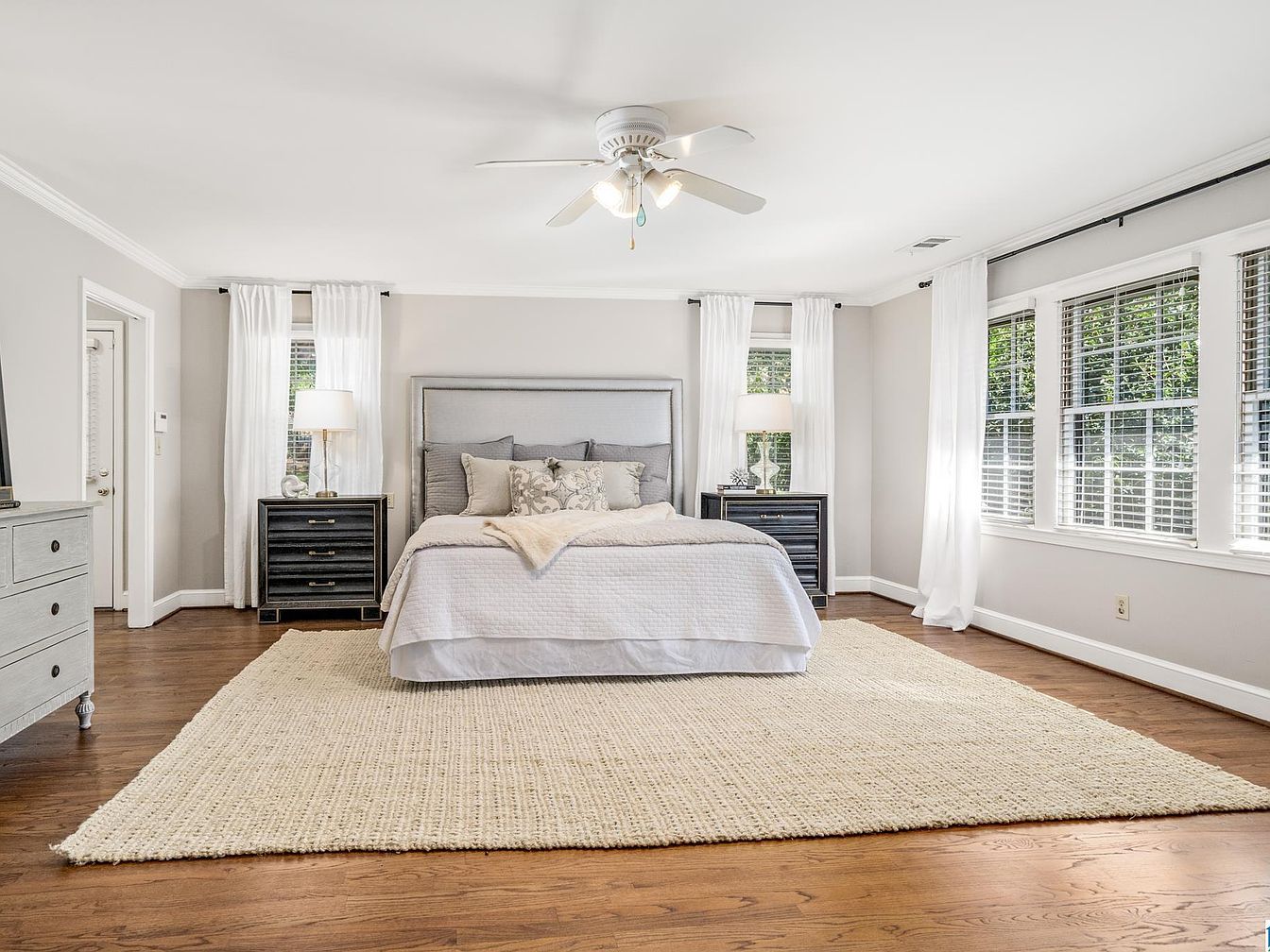 Spacious bedroom with a serene, airy feel. Centered is a bed with a light-gray upholstered headboard, layered in white and soft gray bedding accented by decorative pillows. Matching black nightstands flank either side of the bed, each topped with a lamp and simple decor. Natural light pours in through large windows covered with sheer white curtains, illuminating the warm, medium-toned hardwood floors. A large textured cream rug anchors the room, while soft gray walls and crisp white baseboards add to the clean, calming atmosphere. Crown molding, a ceiling fan, and classic furniture touches evoke timeless elegance.