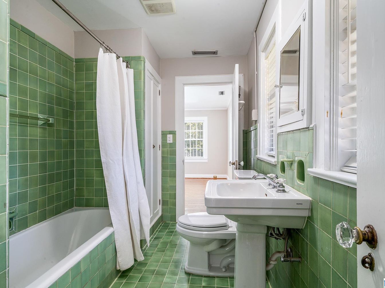 A narrow bathroom featuring a vintage style with green square tiles covering the floor, walls, and the exterior of the bathtub. The bathtub sits to the left with a white shower curtain hung on a metal rod. On the right, a pedestal sink and toilet are aligned against a wall of green tile, with windows above letting in natural light. Above the sink, there is a mirrored medicine cabinet. Walls above the tiles are painted in a soft neutral tone. A doorway at the end of the room leads into a brighter adjacent room with white trim and large windows.