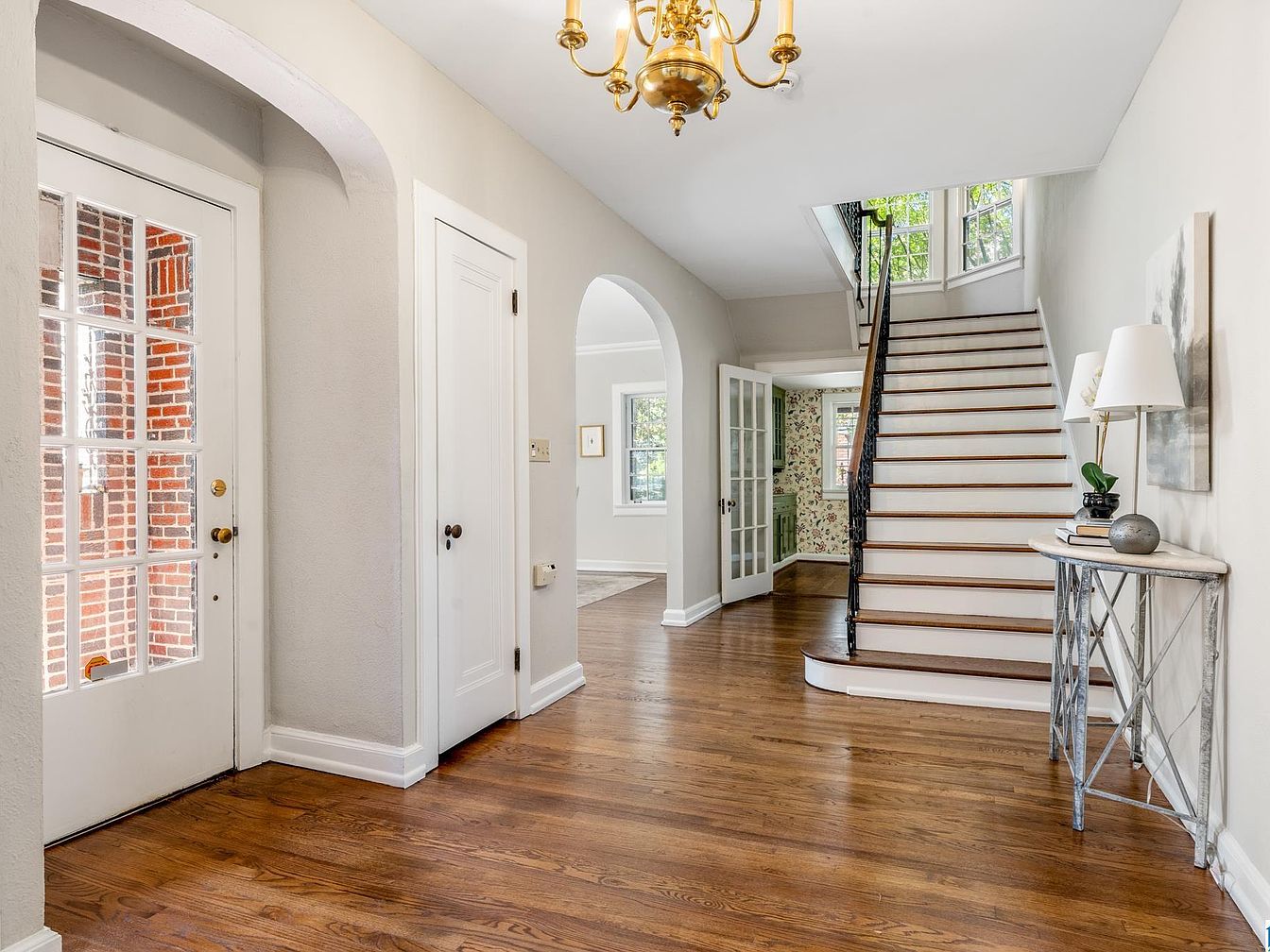 A spacious foyer with warm hardwood floors creates an inviting entryway. To the left, a glass-paneled door framed by red brick stands out against soft, off-white walls. The space features elegant arched entryways leading to adjacent rooms and a sweeping staircase with dark wooden railing and white steps, ascending toward a landing illuminated by large windows. A gold chandelier hangs overhead, adding a touch of vintage charm. A narrow decorative console table with a marble top is placed along the staircase wall, displaying a modern lamp and small art piece, blending historic architecture with tasteful, understated décor.