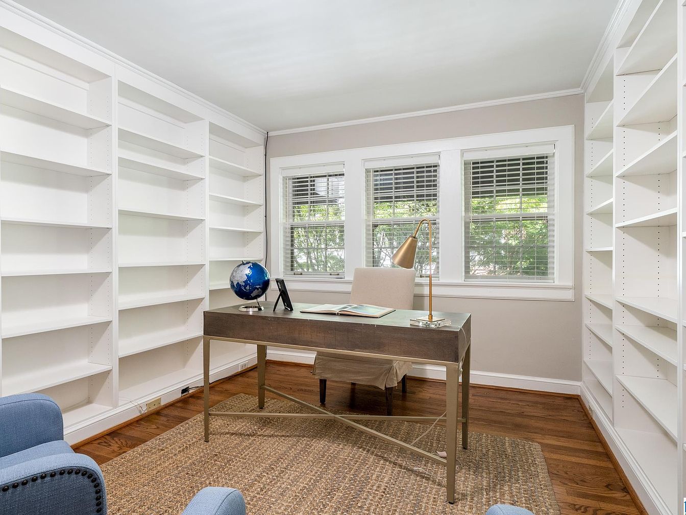 A bright, airy home office with a large wooden desk placed on a rustic woven rug sits centered between floor-to-ceiling white built-in shelves lining two walls. The desk is topped with a desk lamp, a globe, and a few books. An upholstered beige chair is positioned behind the desk, facing three wide windows that let in natural light and look out onto leafy greenery. Two blue armchairs, partially visible, add a touch of color. The walls are painted a light taupe, with crisp white trim and crown molding accenting the clean, classic style of the space.