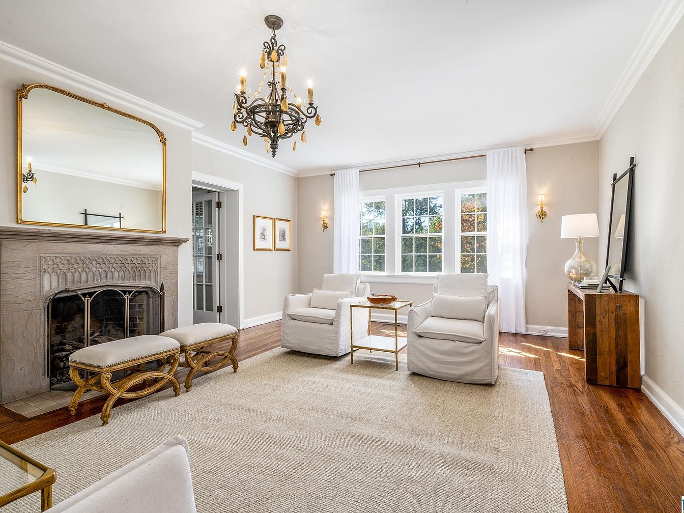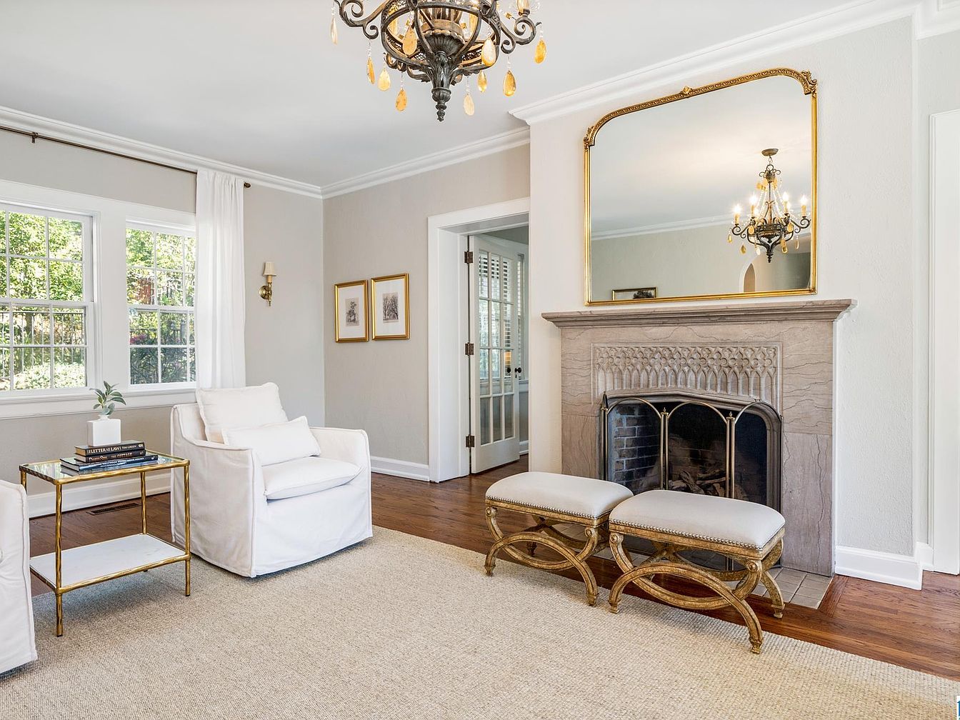 Bright and elegant living room with a stone fireplace as the focal point, topped by a large gold-framed mirror. Two ornate benches with upholstered cushions rest in front of the fireplace. The room features light grey walls, crown molding, and hardwood floors with a neutral woven area rug. Plush white armchairs flank a gold and glass side table, which holds books and a small potted plant. The windows bring in abundant natural light, softened by white curtains. Brass sconces and a vintage chandelier with amber accents add warmth and a touch of historic charm to the space.