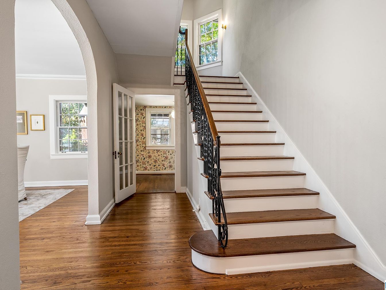 A traditional entryway featuring gleaming hardwood floors that lead to a staircase with wooden treads and a dark wrought iron handrail. The space is open and filled with natural light from a window mid-stair, complemented by cream-colored walls and simple trim. An arched entry separates the stair from an adjacent living room area, where soft neutral tones and minimal decor create an inviting transition. Through a set of glass-paned French doors, a room with floral wallpaper and more windows brings color and pattern to the classic, airy style of the home. The atmosphere is both warm and welcoming.