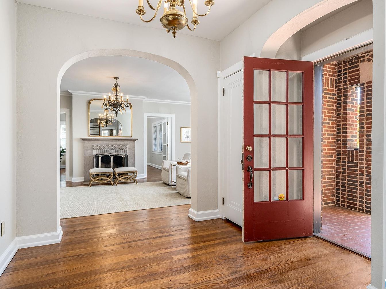 Stepping through a deep red, paned door, you enter a bright entryway with warm, polished hardwood floors. Arched doorways lead into an elegant living room, which features neutral-toned walls and a wide fireplace crowned by a large gold-framed mirror. A pair of upholstered benches sit before the hearth, and a plush light rug centers the comfortable seating area. A sparkling chandelier adds vintage flair, complementing classic brass lighting fixtures in the entry. To the right, exposed brick and another arch indicate a breezeway or porch area, blending historic architectural charm with welcoming, timeless décor.