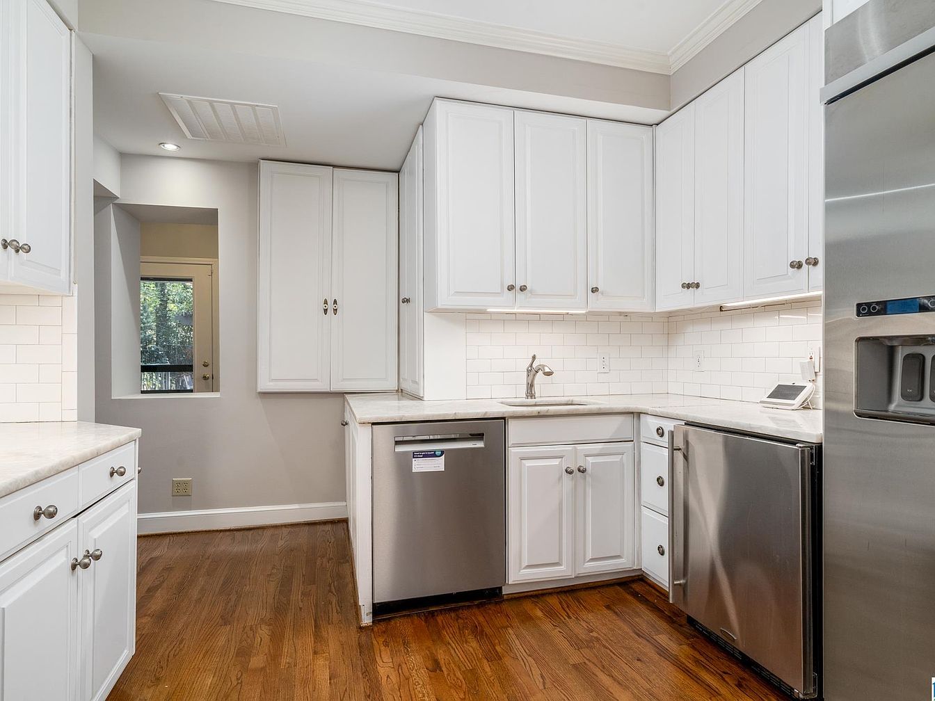A bright, classic kitchen featuring clean white cabinetry with shaker-style doors and brushed metal hardware, arranged in an L-shape for efficient use of space. The countertops are a pale, marbled quartz or granite, paired with a white subway tile backsplash that adds subtle texture. Stainless steel appliances, including a dishwasher and refrigerator, give a modern touch. Under-cabinet lighting provides a warm, inviting glow on the counters. The flooring is a rich, medium-tone hardwood, adding warmth and contrast to the mostly white room. Soft, neutral wall colors and crown molding create a crisp, timeless atmosphere, while ample cabinetry offers abundant storage.