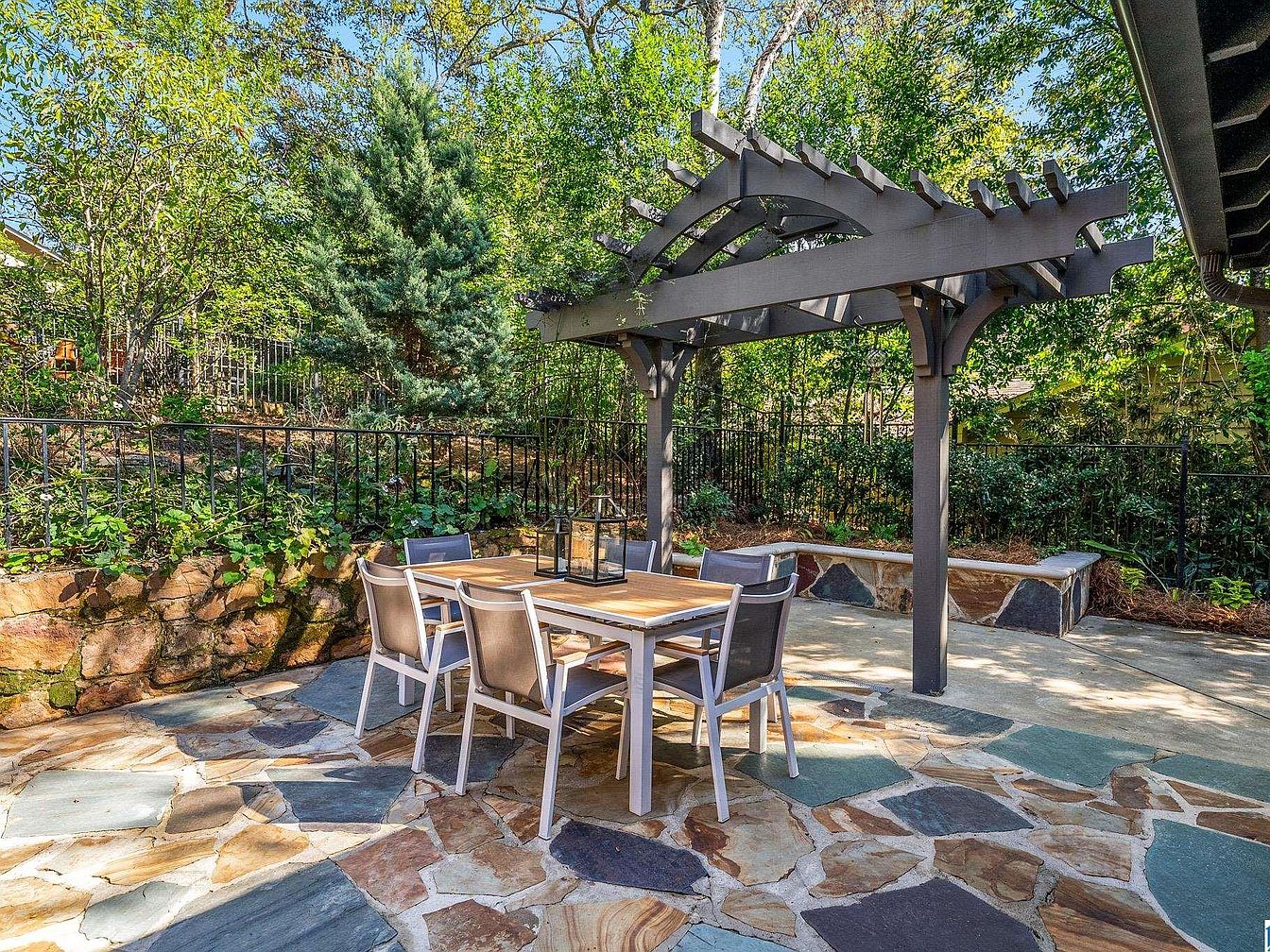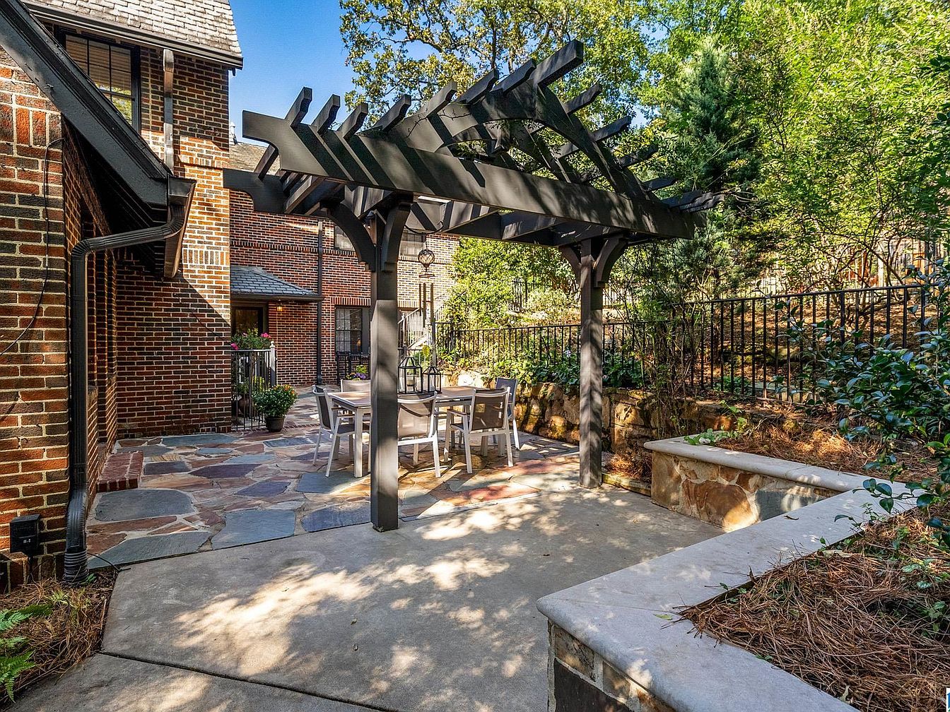 A flagstone patio sits next to a historic brick house, bordered by raised stone planters filled with mulch and greenery. A dark wooden pergola stands over a modern outdoor dining table with white chairs, creating a shaded seating area. The house’s red and brown brick exterior features multi-paned windows and a steeply pitched shingle roof, lending the scene a classic, timeless aesthetic. Black metal railings edge the boundary, with mature trees and bushes providing natural privacy and a lush backdrop. The setting is welcoming and serene, with a balance of architectural structure and organic beauty.