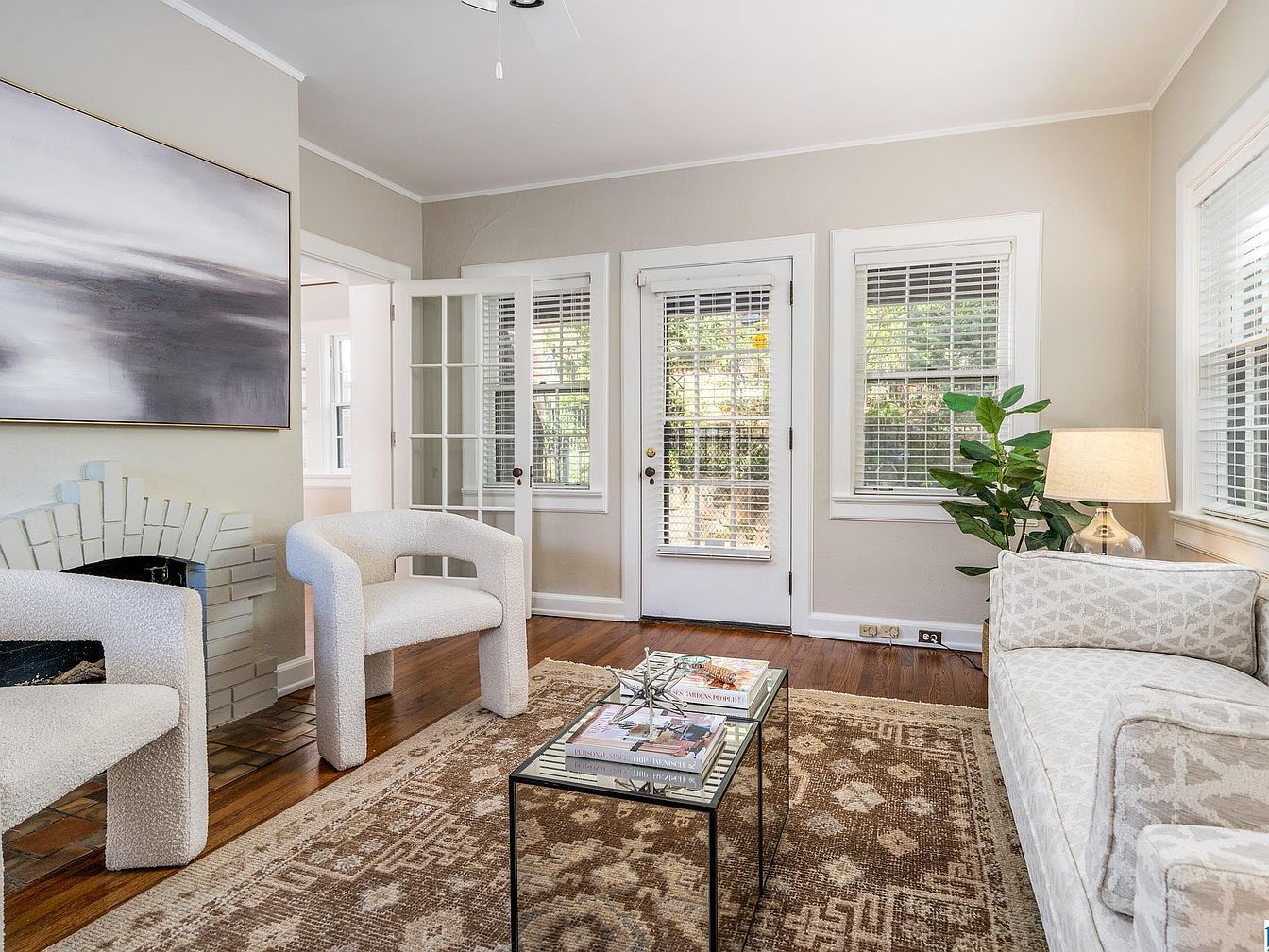 A cozy living room with a warm, neutral palette. Soft beige walls and white trim contribute to an airy, inviting atmosphere. The centerpiece is a geometric brick fireplace painted white, complemented by two textured boucle armchairs. A patterned area rug in earth tones covers hardwood floors, tying together the modern coffee table with stacked books. A light-toned, patterned sofa sits against the wall beneath windows with white blinds, next to a round glass lamp and a green leafy plant. Large French doors and multiple windows fill the room with natural light, showcasing classic architectural features and thoughtful styling.