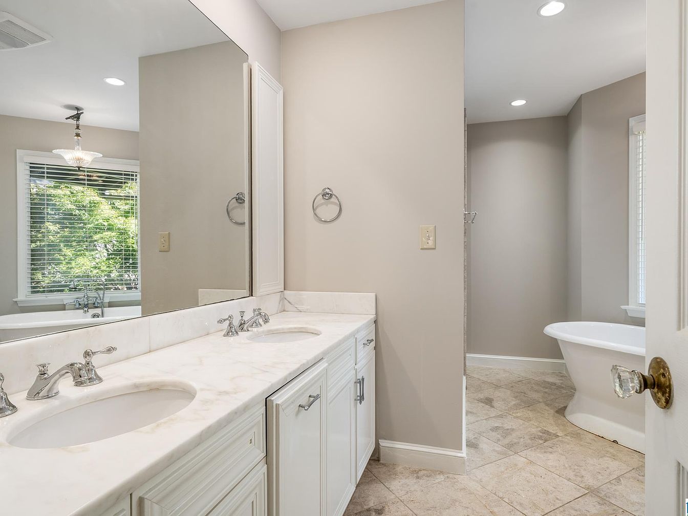 Spacious bathroom featuring a long marble double-sink vanity with polished chrome fixtures and cream cabinetry. The vanity is set beneath a large wall mirror, with recessed lighting providing bright illumination. The walls are painted a soft beige, adding to the calm and neutral color scheme. Light tiles cover the floor, extending throughout the room. In the background, a freestanding white bathtub is positioned near two corner windows framed by white trim and blinds, letting in natural light and offering views of leafy greenery outside. The room blends classic elegance with clean, modern lines.