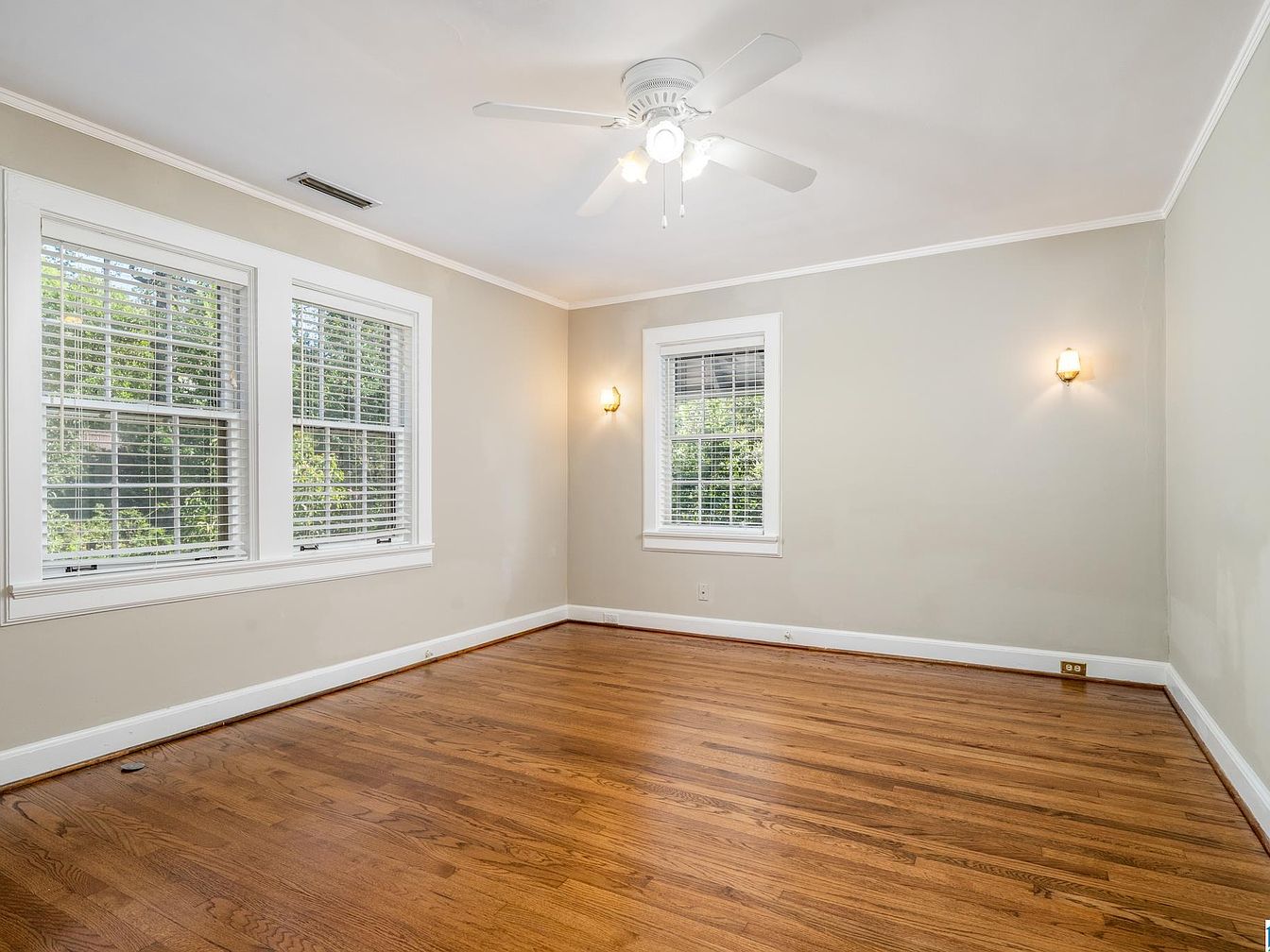 A spacious, empty room with honey-toned hardwood floors and light beige walls creates a calm and inviting atmosphere. Large double windows with white trim let in abundant natural light and offer views of lush greenery outside. A ceiling fan with light is centered above, complemented by two elegant wall sconces on either side of the single window, casting a soft glow. The baseboards and crown molding are painted white, providing crisp contrast against the neutral wall color. The overall design feels clean and bright, with architectural lines that are simple yet classic, perfect for a restful bedroom setting.