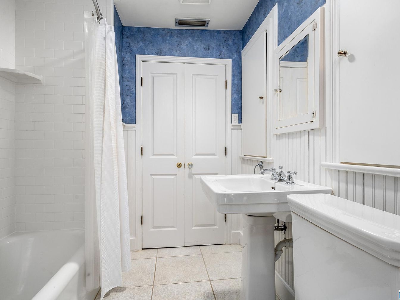 A compact yet bright bathroom with a traditional aesthetic, featuring white beadboard wainscoting on the lower half of the walls and a textured blue wallpaper above. The room is centered around a double-door closet, flanked by a classic pedestal sink and a modern white toilet. To the left, a white tiled bathtub with a light shower curtain sits beneath a small shelf. Neutral ceramic tile flooring enhances the fresh, airy atmosphere, while the white cabinetry and simple chrome fixtures provide understated elegance. The space feels clean and cohesive, with a nod to historic charm in its finishes.
