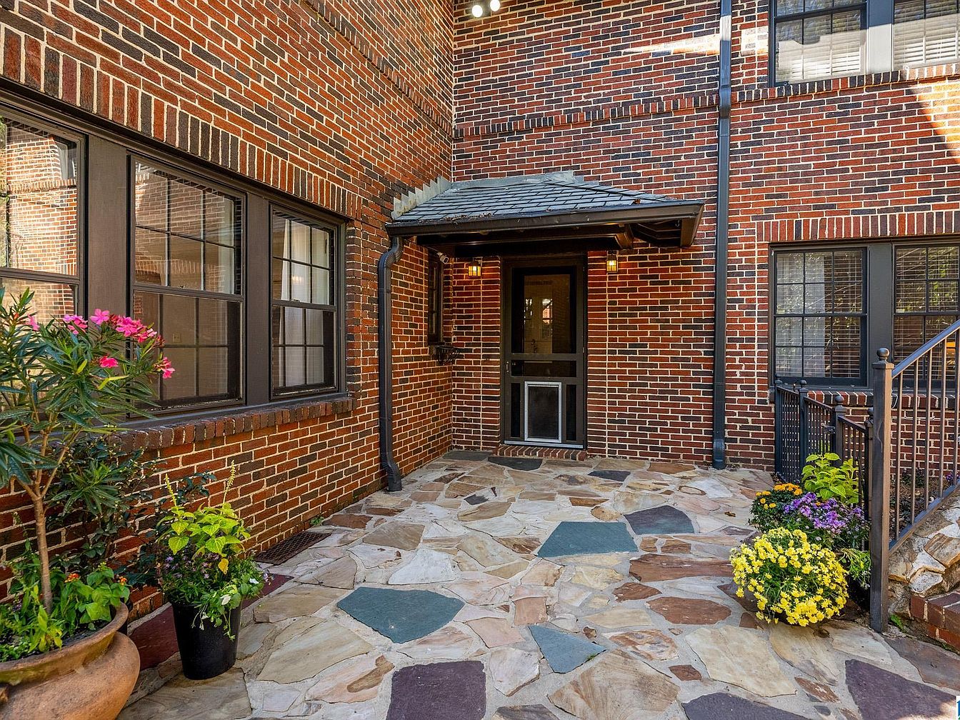 A cozy brick entryway bordered by sections of dark-trimmed windows and a sturdy dark wooden door. The floor is paved with irregularly shaped flagstones in earthy tones, including tan, gray, and deep violet, giving the area a welcoming, rustic charm. Planters with blooming pink, yellow, and purple flowers add color and vibrancy to the space, softening the strong lines of the reddish brick exterior. Simple black sconces by the doorway provide warm, ambient lighting. A wrought iron railing leads up to the entry, harmonizing traditional architectural elements with cheerful, lived-in touches.