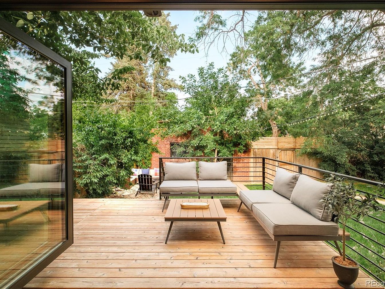A spacious wooden deck extends outward, framed by sleek black metal railings and lush greenery surrounding the area. Two modern, low-profile couches with thick beige cushions create a comfortable conversation space, centered around a rectangular wooden coffee table holding a small tray. Overhead, string lights add a cozy, inviting touch, perfect for evening gatherings. Potted plants add natural accents to the clean lines of the furniture. In the background, there is a manicured lawn, a wooden privacy fence, and dense leafy trees that create a sense of seclusion. The overall look is modern yet warm, blending outdoor relaxation with contemporary design.