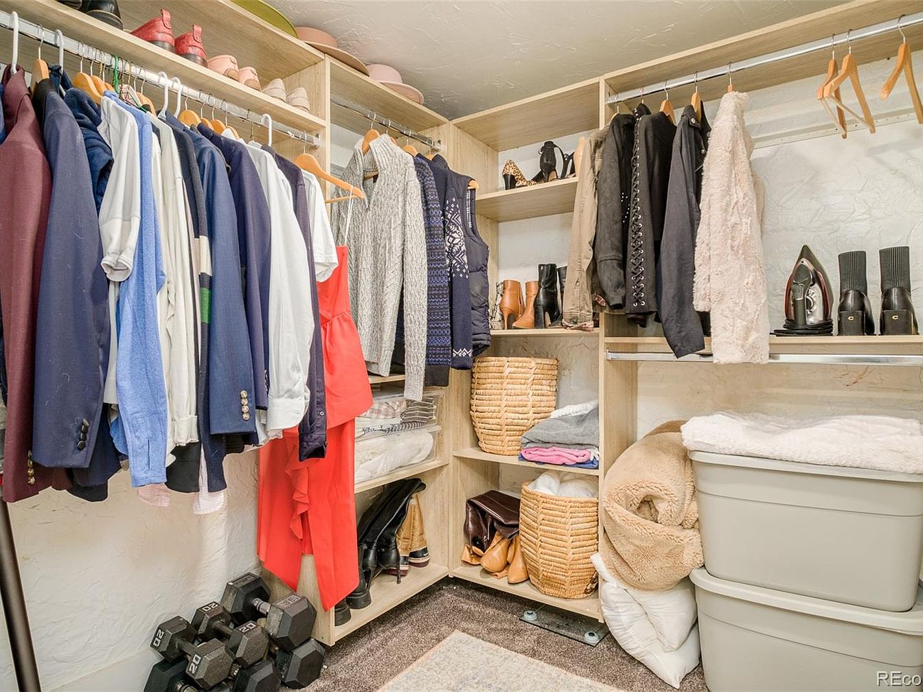 A spacious walk-in closet featuring open light wood shelving and hanging rods along two walls. Clothing is neatly arranged, with shirts, jackets, and dresses on wooden hangers, while a selection of sweaters are folded on open shelves. Shoes and boots are displayed on the middle shelves, and hats line a top shelf. Two woven baskets sit beneath for additional storage, alongside rolled blankets and stacked storage bins. Soft, neutral tones dominate, with beige carpeting underfoot and textured white walls. The space feels organized and functional, enhanced by natural colors and thoughtful arrangement for both easy access and visual appeal.