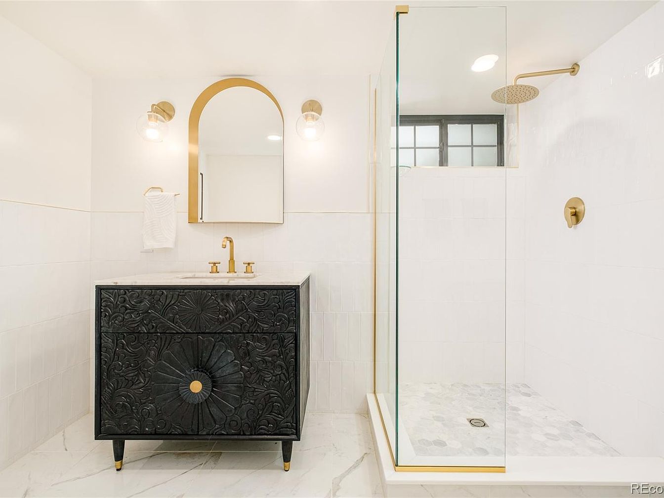 A modern bathroom features a striking black vanity cabinet with intricate carved floral details and brass hardware, paired with a sleek stone countertop. Above the vanity hangs a large arched mirror framed in gold, flanked by two minimalist, round glass globe sconces. To the right, a walk-in shower area is enclosed by clear glass panels, with brass fixtures including a rain shower head and control knob. The space is finished with gloss-white tile walls, marble-patterned floor tiles, and subtle gold accents throughout, combining classic luxury with contemporary design and a sense of spaciousness and light.