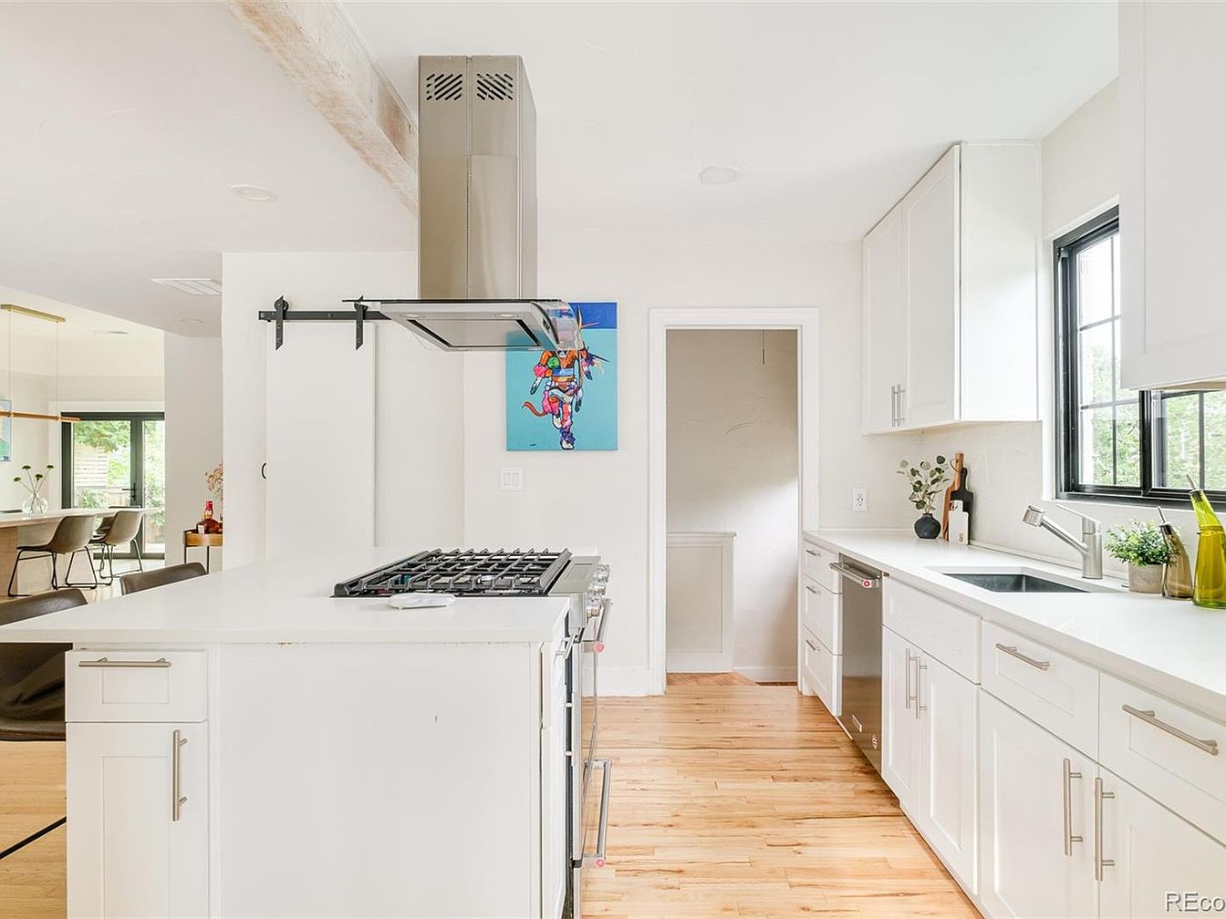 A bright, airy kitchen featuring a long island with a built-in gas range and white cabinetry. The countertops and cabinets are sleek white, creating a clean modern look that contrasts nicely with the warm light wood flooring. Stainless steel appliances, a deep farmhouse-style sink, and a black-framed window over the sink add a hint of industrial chic. Potted plants and glass bottles lend a subtle organic touch. An exposed wood ceiling beam adds historical character. A vibrant painting with blue background injects color and contemporary flair, while soft natural light bathes the whole space, inviting warmth and openness.