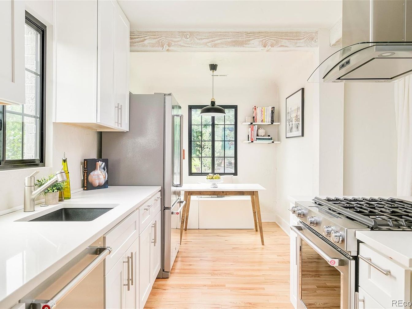 Bright, airy kitchen with white cabinetry, quartz countertops, and stainless steel appliances. The wood floors add warmth to the predominantly white space. On the left, a sleek modern sink area is complemented by a cookbook and a potted plant. The view extends to a breakfast nook with a simple wooden table and minimalist bench, illuminated by a black pendant light. Black-framed windows along the side and back walls bring in natural light and contrast with the white palette. Floating shelves hold books and decor, while a framed art piece adds a subtle touch to the right wall.