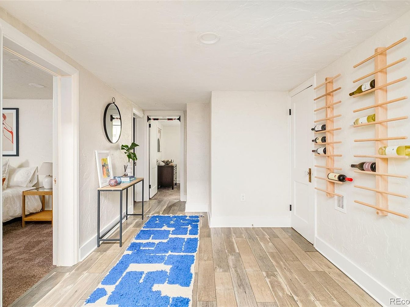 A narrow hallway with light wooden floors and white textured walls, featuring a modern aesthetic with clean lines and minimalistic decor. On the right wall, two vertical wooden racks hold assorted wine bottles, adding a touch of sophistication. A bright blue abstract rug runs along the length of the hall, providing a bold pop of color. On the left side, a slim console table supports artwork, a plant, and small decorative objects beneath a round mirror. One open doorway leads into a cozy bedroom with neutral bedding and simple furnishings. The overall effect is fresh, airy, and contemporary.