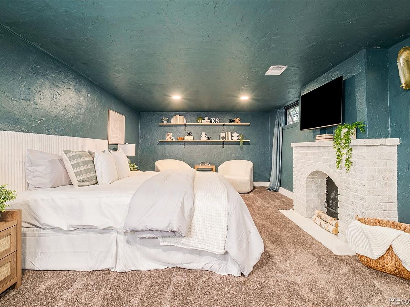 A cozy bedroom features a large bed with a white, fabric-upholstered headboard and crisp, white bedding accented by a single sage-patterned pillow. The room’s walls and ceiling are painted a rich teal color with a textured finish, creating a calming and intimate atmosphere. To one side, a brick fireplace painted white adds classic charm, topped with potted greenery and a wall-mounted television above. Plush beige carpeting covers the floor, while a woven basket with a blanket rests near the hearth. Two modern, cream-colored armchairs and floating shelves with decorative items complete the inviting, elegant look of this restful space.