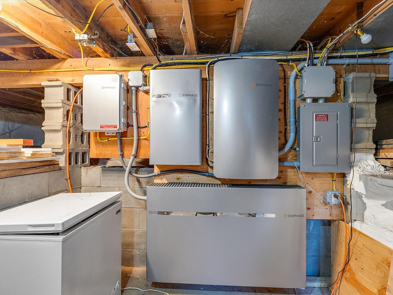 Unfinished basement utility area featuring exposed wooden beams and ceiling joists overhead, with visible insulation inserts between beams. A suite of modern Enphase energy storage and electrical systems is wall-mounted, with metal conduit and neatly managed wiring in yellow and orange. A large silver chest freezer sits on the concrete floor, next to unfinished walls made of cinderblock and wood paneling. The space includes makeshift shelving with stacked lumber, adding to the utilitarian feel. Overall, the area highlights the essential systems of the house in a clean and organized manner with a functional, industrial atmosphere.