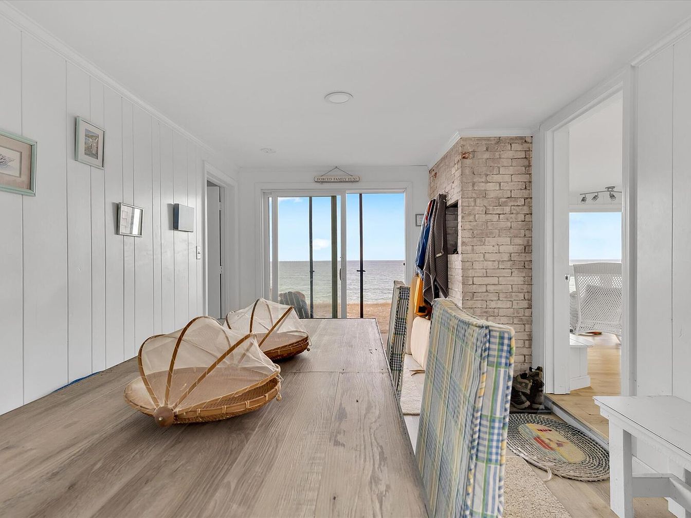 A cozy coastal dining area features a rustic wooden table set with two mesh food covers at its center. Chairs upholstered in pastel plaid patterns add a touch of softness and color against the otherwise neutral palette. Tongue-and-groove white paneled walls enhance the room’s airy brightness, while small framed artworks are arranged in a neat line. A whitewashed brick accent wall adds texture next to an open entryway leading to a sitting room filled with natural light. Glass sliding doors frame a clear view of the ocean, inviting the seaside atmosphere into the relaxed, beach-inspired interior.