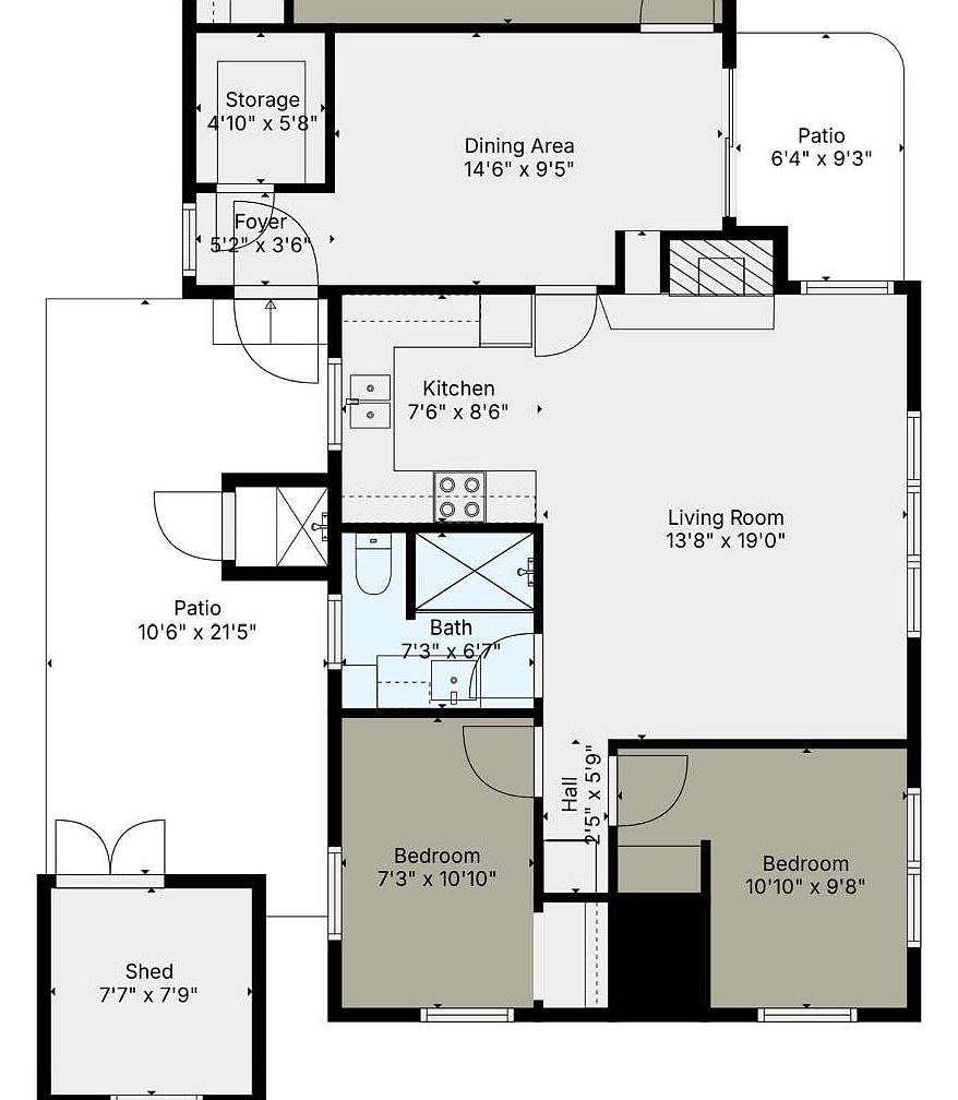 This floor plan displays a single-story house layout featuring a clear division of spaces. The entrance leads to a foyer connecting to a storage room and the dining area. The kitchen, compact and functional, sits at the heart of the home adjoining both the dining and living rooms. The living room is spacious, with ample natural light likely from large windows. Two bedrooms are positioned near the bathroom, accessible via a short hallway. Patios provide outdoor access from multiple points, while a shed is detached in the backyard. The design prioritizes efficiency, connectivity, and easy movement throughout the dwelling.