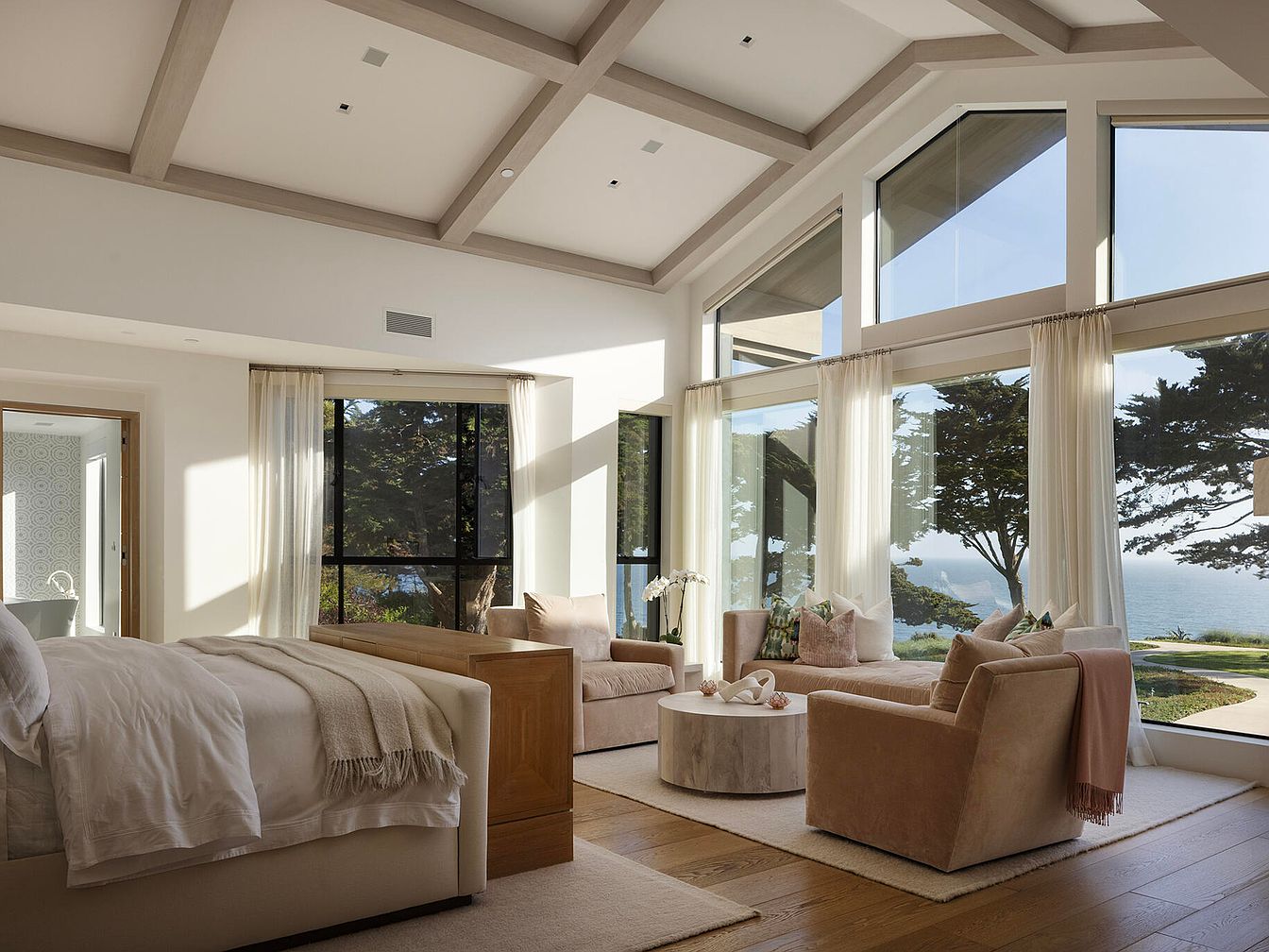 This spacious bedroom features a high, vaulted ceiling accentuated by soft wooden beams, lending an airy feel. Large, floor-to-ceiling windows frame stunning views, allowing natural light to flood in. The color scheme includes warm neutrals and delicate pastels, enhancing the calming atmosphere. A plush bed, adorned with a light comforter and cozy throw, anchors the room. Nearby, a round coffee table with a textured finish sits between two inviting armchairs, arranged for relaxation. Light, flowing drapes soften the sunlight, while polished hardwood floors add warmth, unifying the design with a touch of elegance.