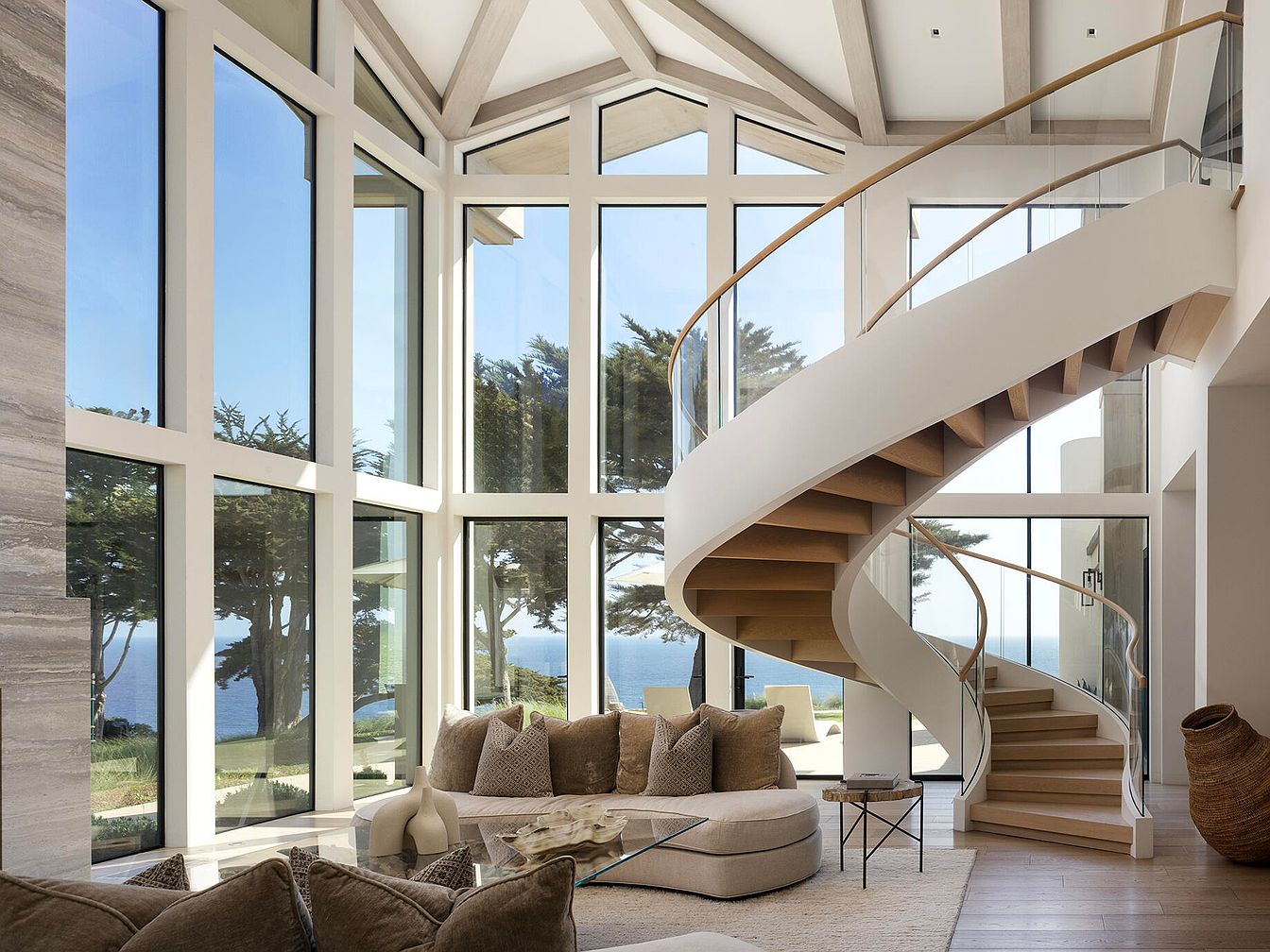 This spacious living room features expansive floor-to-ceiling windows that offer stunning views of the ocean and surrounding greenery. A modern, curved staircase with a seamless blend of wood and glass stands as a focal point, drawing the eye upward. The color palette combines neutral tones with soft browns and creams, enhancing the room’s airy feel. Plush seating arrangements, including a large sectional with decorative pillows, invite comfort. The wood flooring complements the contemporary design, while artistic elements and a textured area rug create a cozy atmosphere, balancing sophistication with a welcoming ambiance.