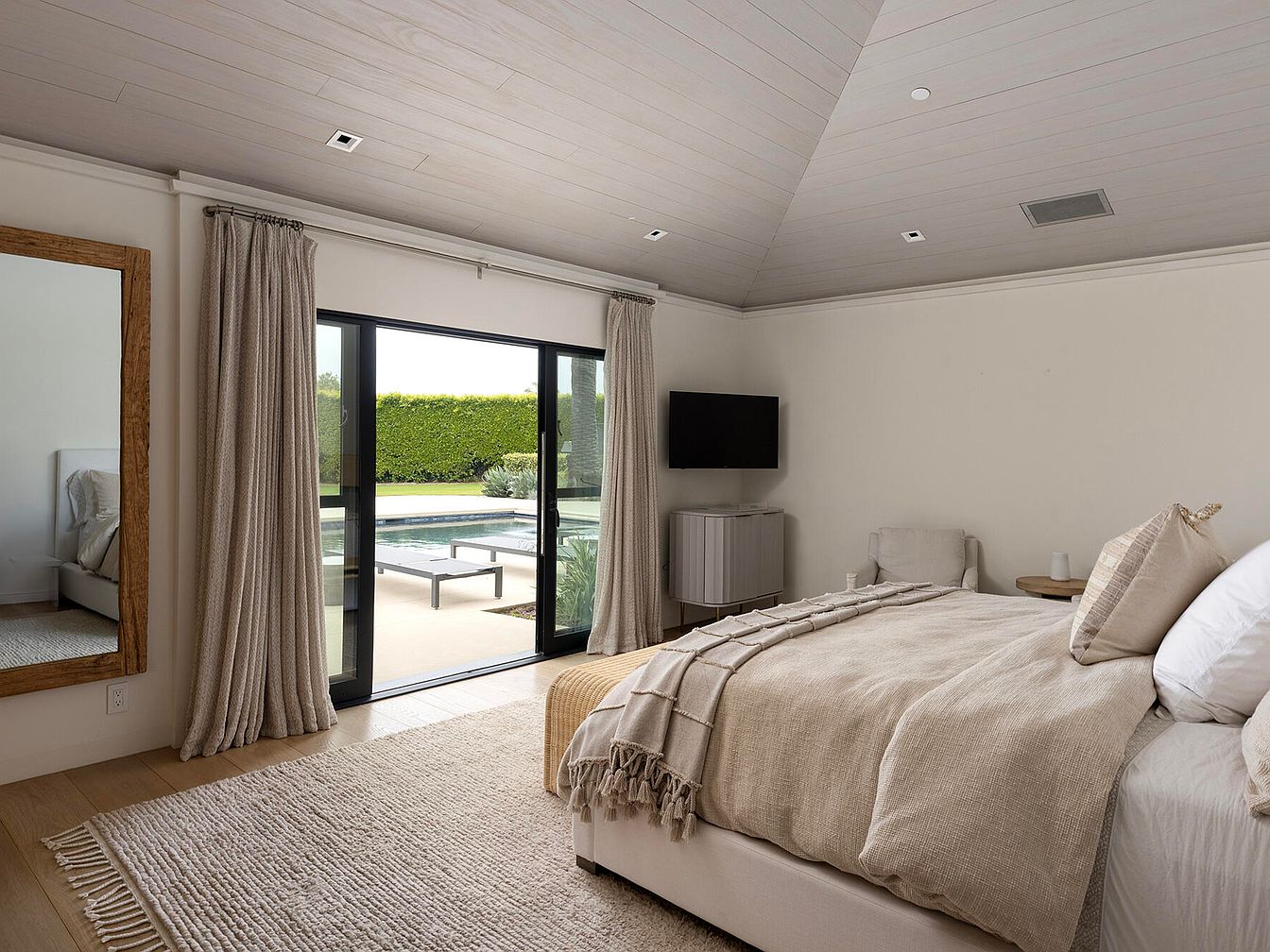 This serene bedroom features a soft, neutral color palette with a seamless blend of beige and white tones. A plush bed, dressed with textured blankets and pillows, serves as the room’s focal point. Wide glass doors lead out to a private patio with views of landscaped greenery and a pool, enhancing the tranquil atmosphere. The ceiling boasts exposed wooden panels, offering warmth and character. A large mirror with an ornate wooden frame reflects light and adds depth. Minimalist furniture, including a sleek nightstand and cozy chair, provides functionality while maintaining a clean, uncluttered look.