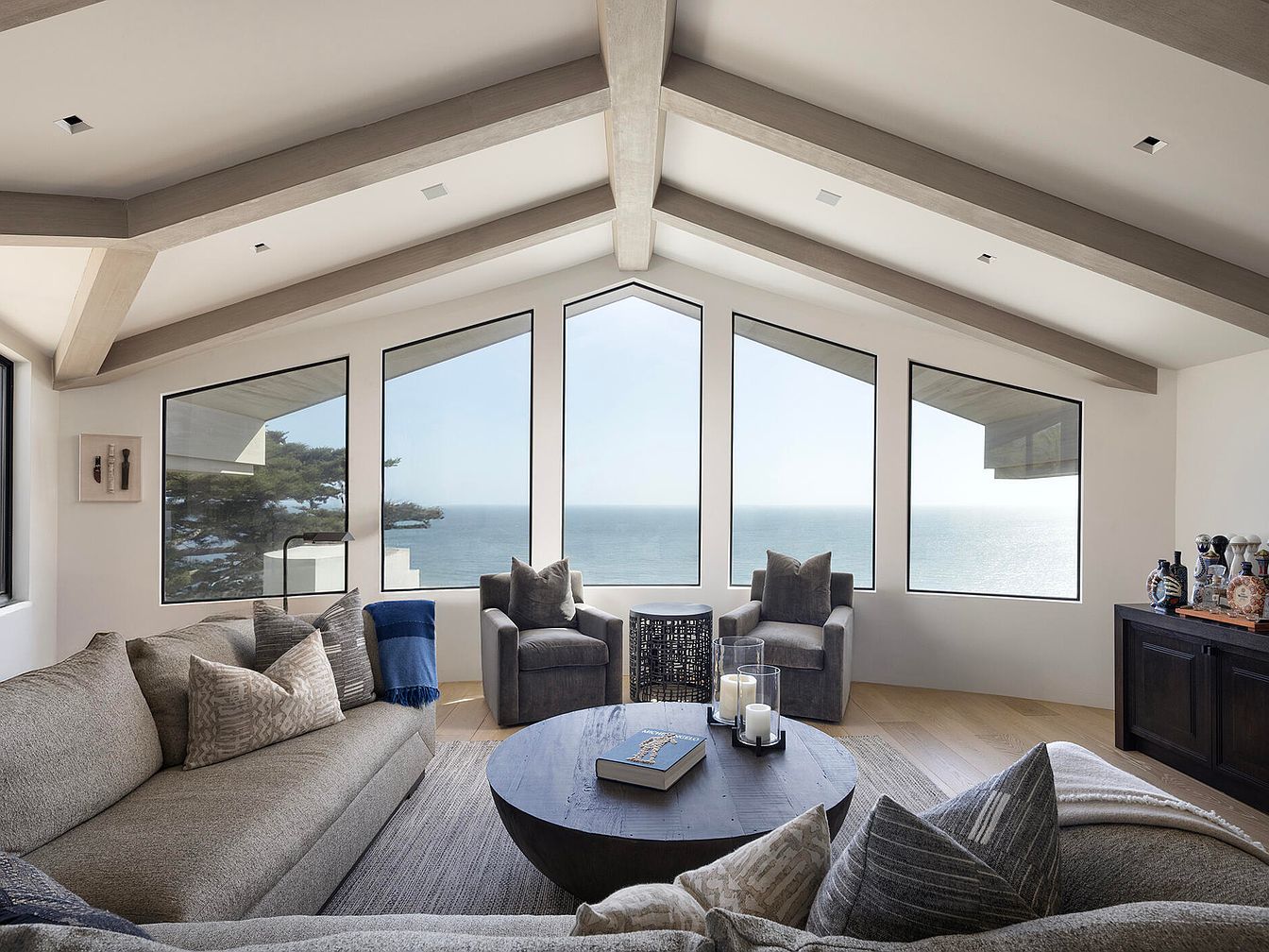 A modern living room featuring large, panoramic windows that frame a stunning ocean view. Natural light floods the space, highlighting a warm color palette of grays and soft neutrals. A plush, curved sofa adorned with patterned throw pillows offers comfort, while two sleek armchairs complement the furniture arrangement. A circular wooden coffee table serves as a focal point, inviting relaxation. Exposed wooden beams across the ceiling add architectural interest, balanced by smooth white walls. Nearby, a dark wooden credenza showcases decorative items, contributing to the room’s sophisticated yet cozy atmosphere, perfect for casual gatherings or quiet evenings.