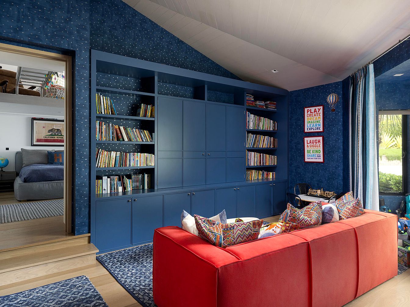 This vibrant playroom features a bold blue theme, evident in the textured wall and ceiling that create an energizing backdrop. A massive blue bookshelf filled with neatly arranged books stands prominently, complemented by colorful children’s artwork displayed on the walls. The red sectional sofa adds a striking contrast, adorned with patterned throw pillows that enhance the playful atmosphere. Natural light enters through expansive windows, illuminating the light wooden floor, which adds warmth. A cozy reading nook can be spotted in the corner, while playful toys and a small table invite interaction, fostering creativity and imagination.